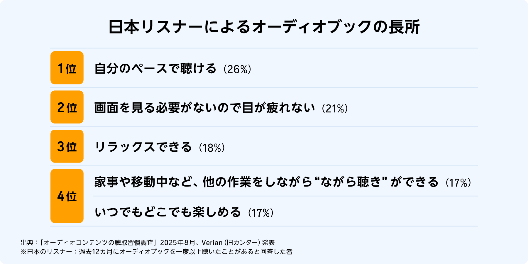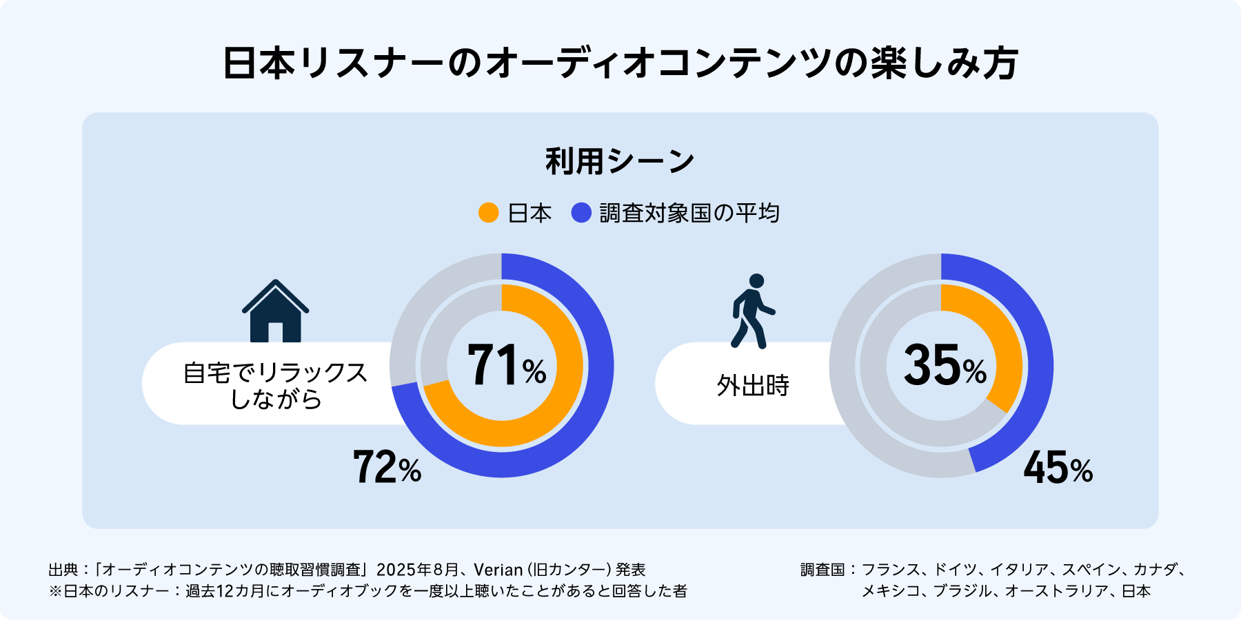 注:「Audible Compass」は、リスニング文化に関する年次調査として、Audibleの委託により市場調査機関Verian(旧カンター)が実施しています。2025年の調査では、オーストラリア、カナダ、フランス、ドイツ、イタリア、日本、メキシコ、スペイン、ブラジルの9か国でそれぞれ、18歳から65歳までのインターネットの活発な利用者1,000名*を対象に、2025年7月にオンラインで聴取習慣についてのアンケートを実施しました。