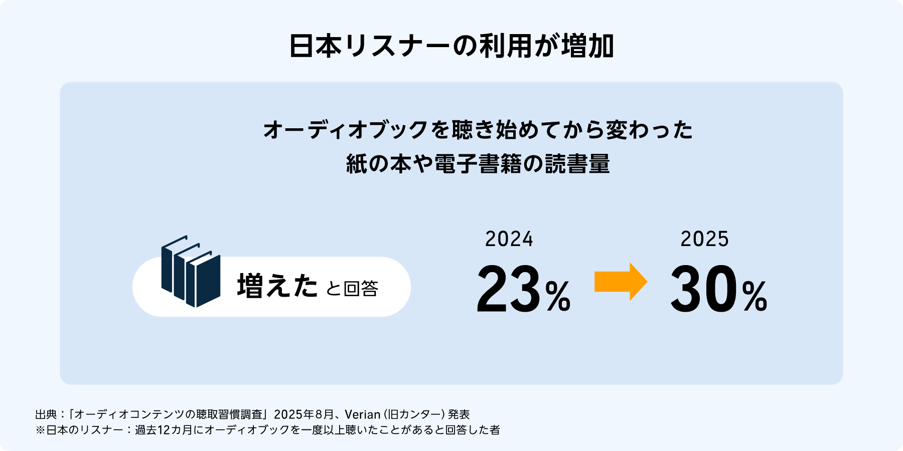 本調査によると、日本国内におけるオーディオブックリスナーの中で、「オーディオブックを聴き始めてから、紙の本や電子書籍の読書量も増えた」に強く同意する層は、2024年の23%から2025年は30%へと7ポイント増加しました。日本のオーディオブックリスナーによる紙や電子書籍といった他の読書手段での読書量が増加しており、日本の読書習慣全体にポジティブな影響を与えていることが示されました。