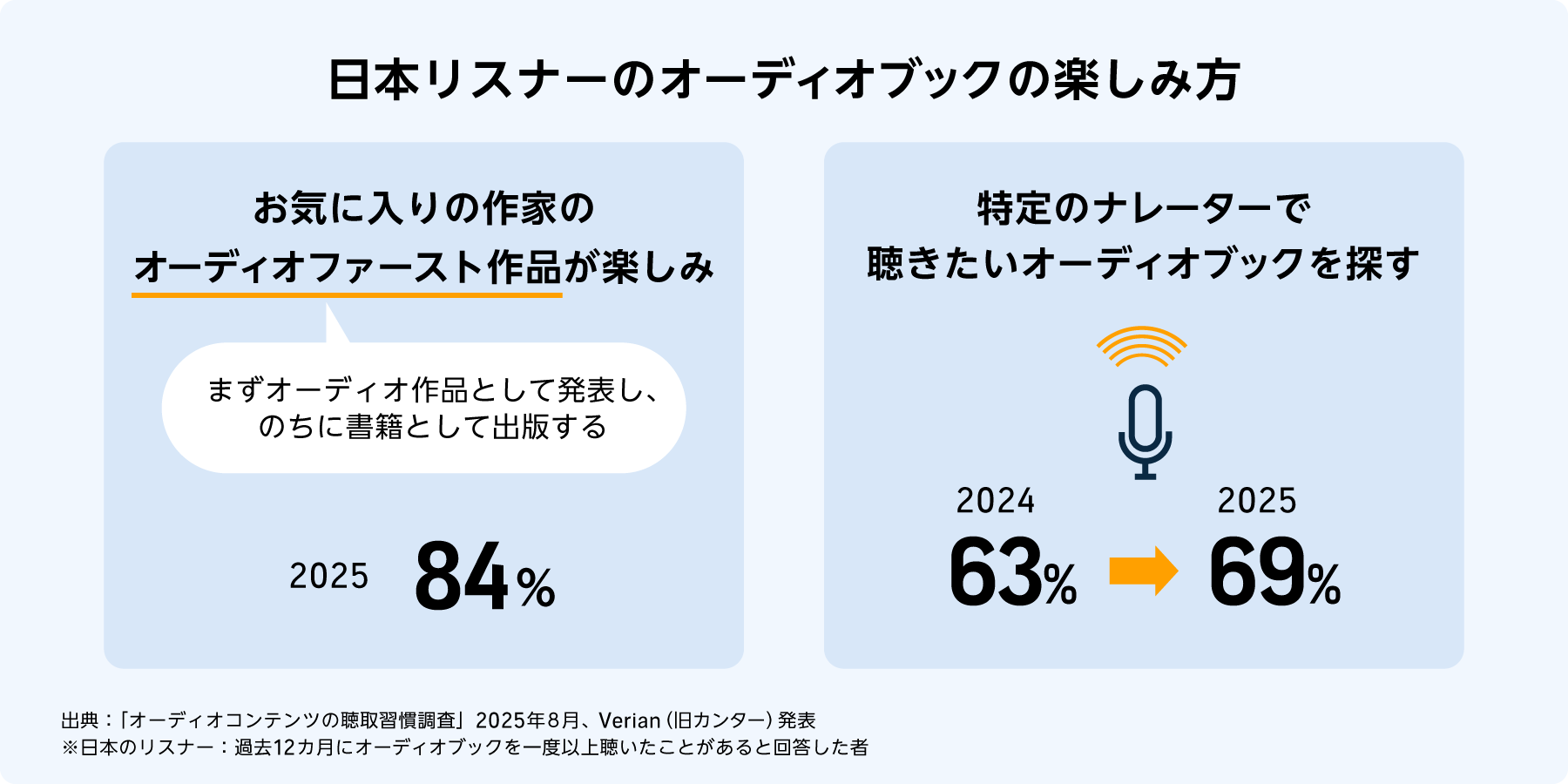 本調査では、オーディオブックを執筆する作家や朗読者といったクリエイターの存在が、リスナーの作品選びにおける重要な基準となっていることもわかりました。「お気に入りの作家がオーディオファースト作品*を作成してくれたら嬉しいと思うか?」という質問には、日本のオーディオブックリスナーの84%が肯定的に回答しました。また「特定のナレーターが朗読したオーディオブックが気に入った場合、そのナレーターが朗読した他のオーディオブックも聴いてみたいと思うか?」という問いには69%が肯定的で、2024年の63%から6ポイント増となりました。