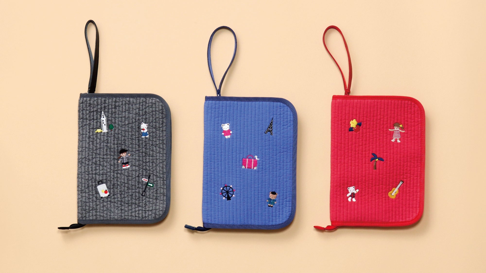 旅先での機能性を重視してデザインされたコラボ限定モデル「voyage(ボヤージュ)」「poche(ポッシュ)」「cocoru(ココル)」が、ダークグレー・ブルー・レッドの3色展開で登場いたします。今回のテーマ「旅行」にちなみ、ニューヨーク・パリ・ハワイをイメージした服装やアイテムを取り入れたモチーフがポイントです。