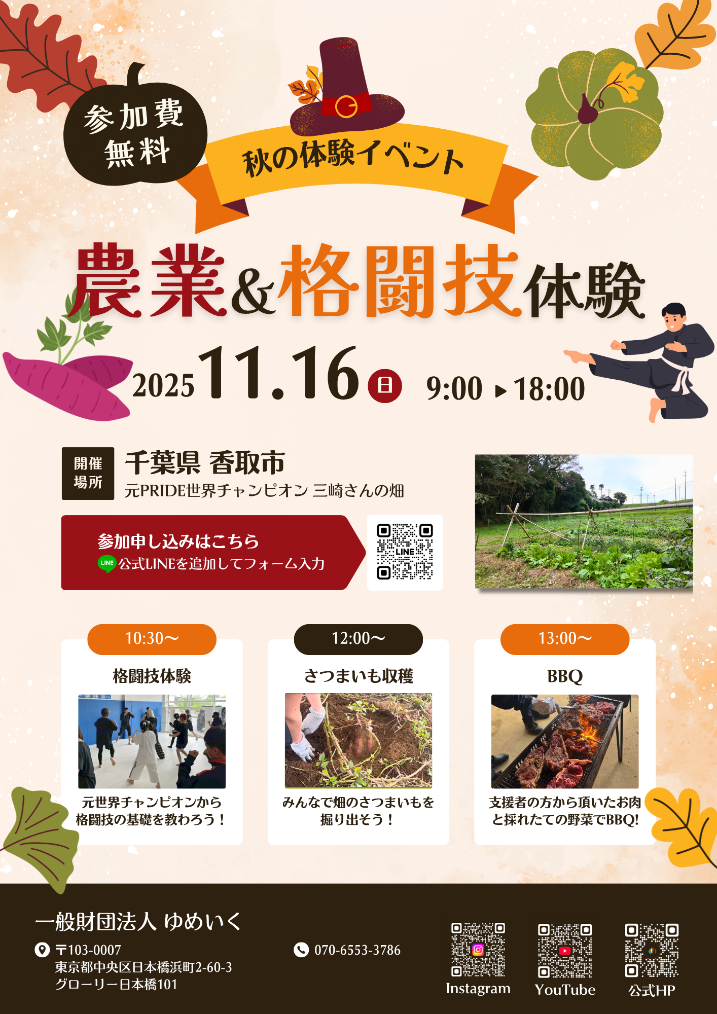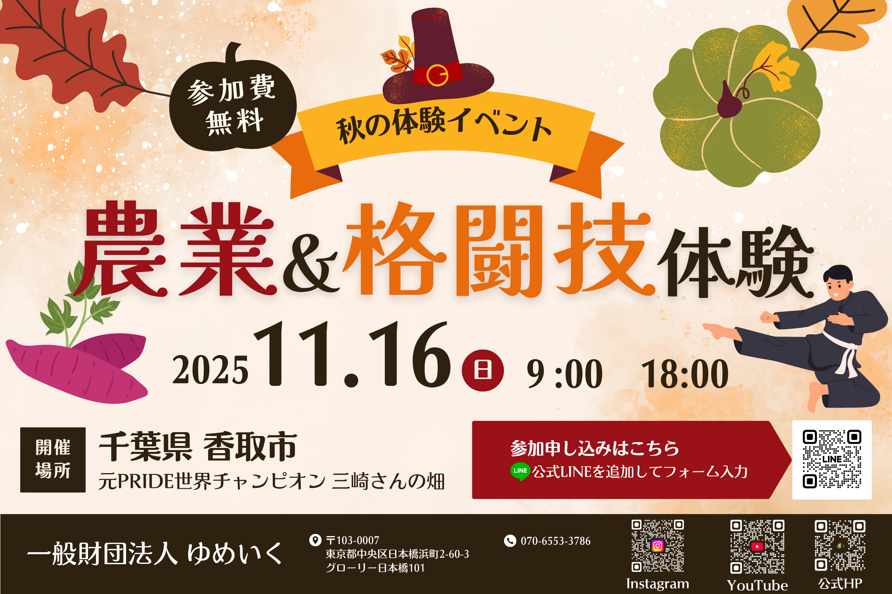 一般財団法人ゆめいくは、2025年11月16日(日)に、千葉県香取市にある三崎和雄さん(PRIDEウェルター級グランプリ2006優勝)の畑を会場として、第3回農業体験を開催します。