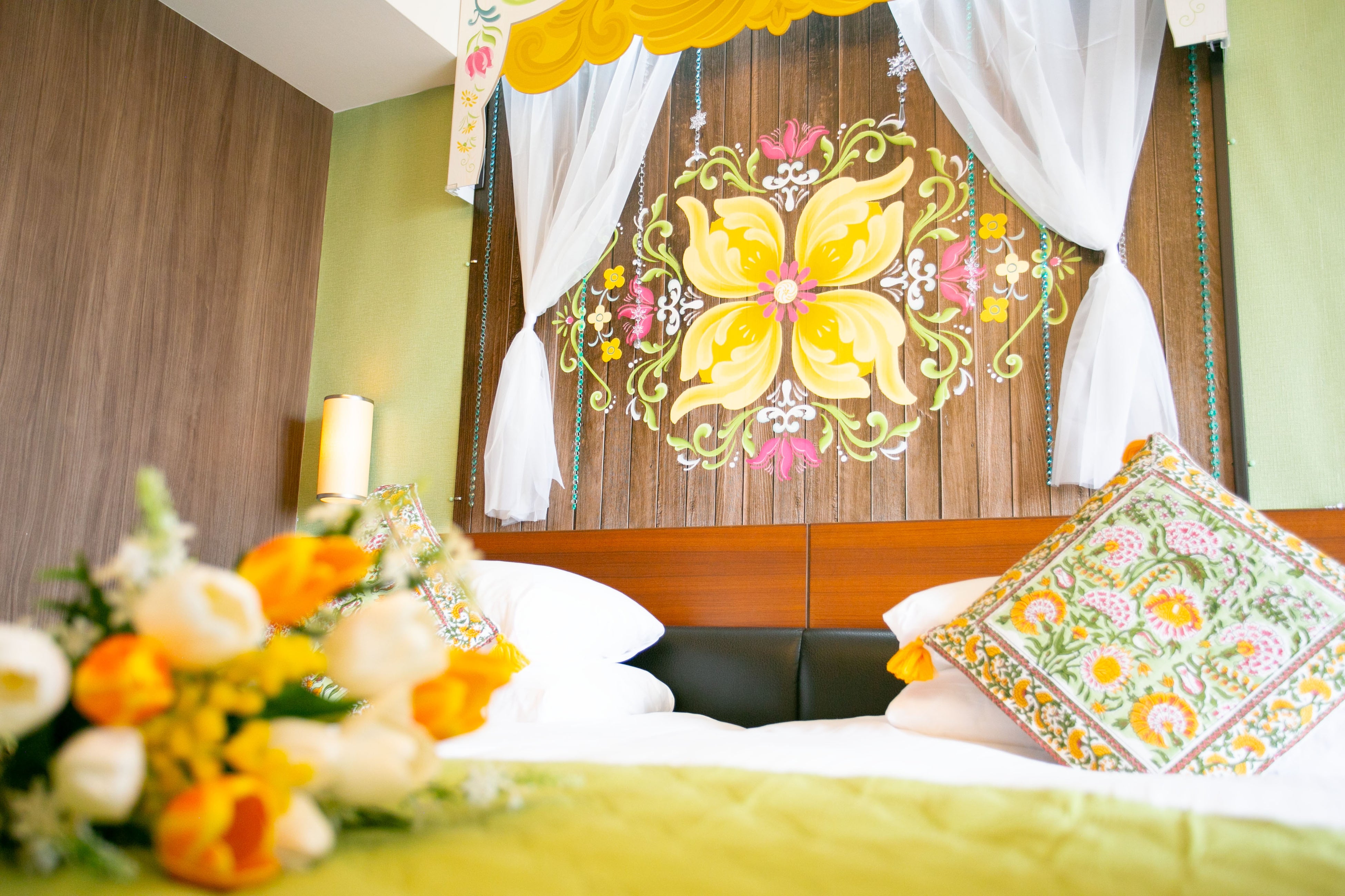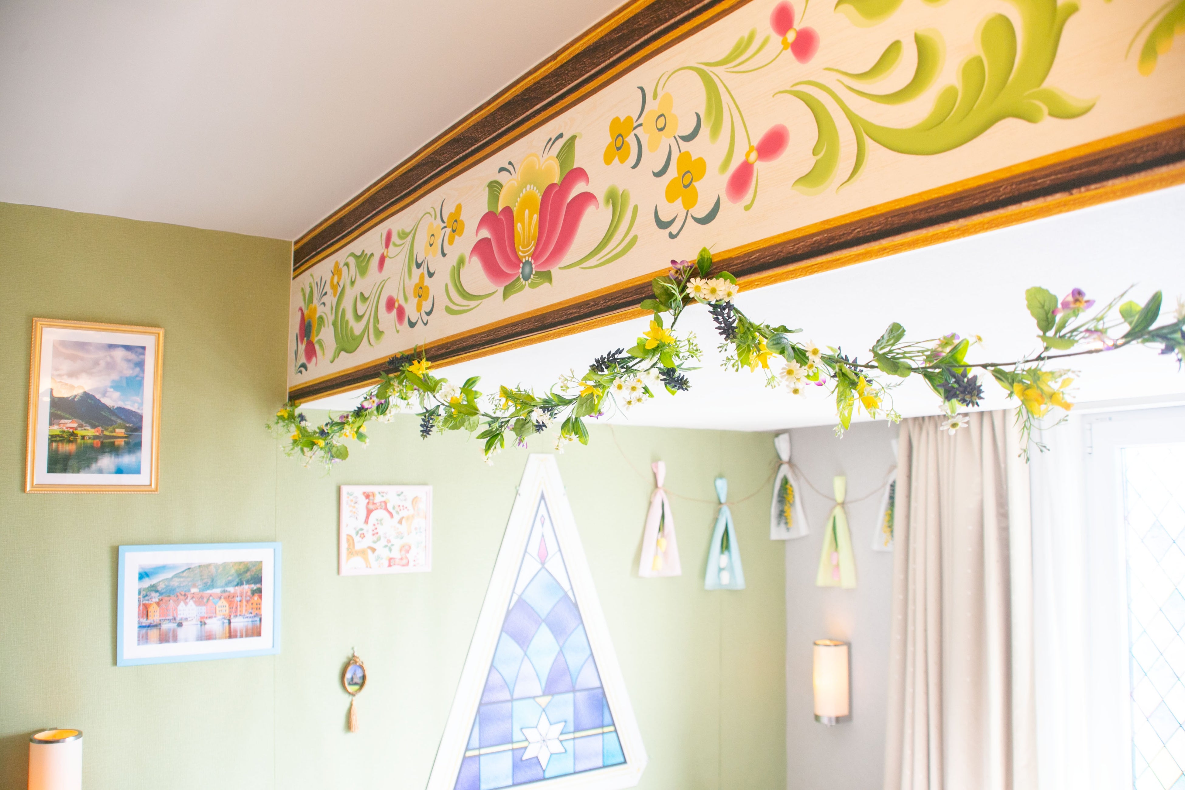 北欧の伝統工芸で花や葉のモチーフが特徴的な「ローズマリング」をイメージした繊細な花々のモチーフが、ベッド上の壁面や天井に施されています。