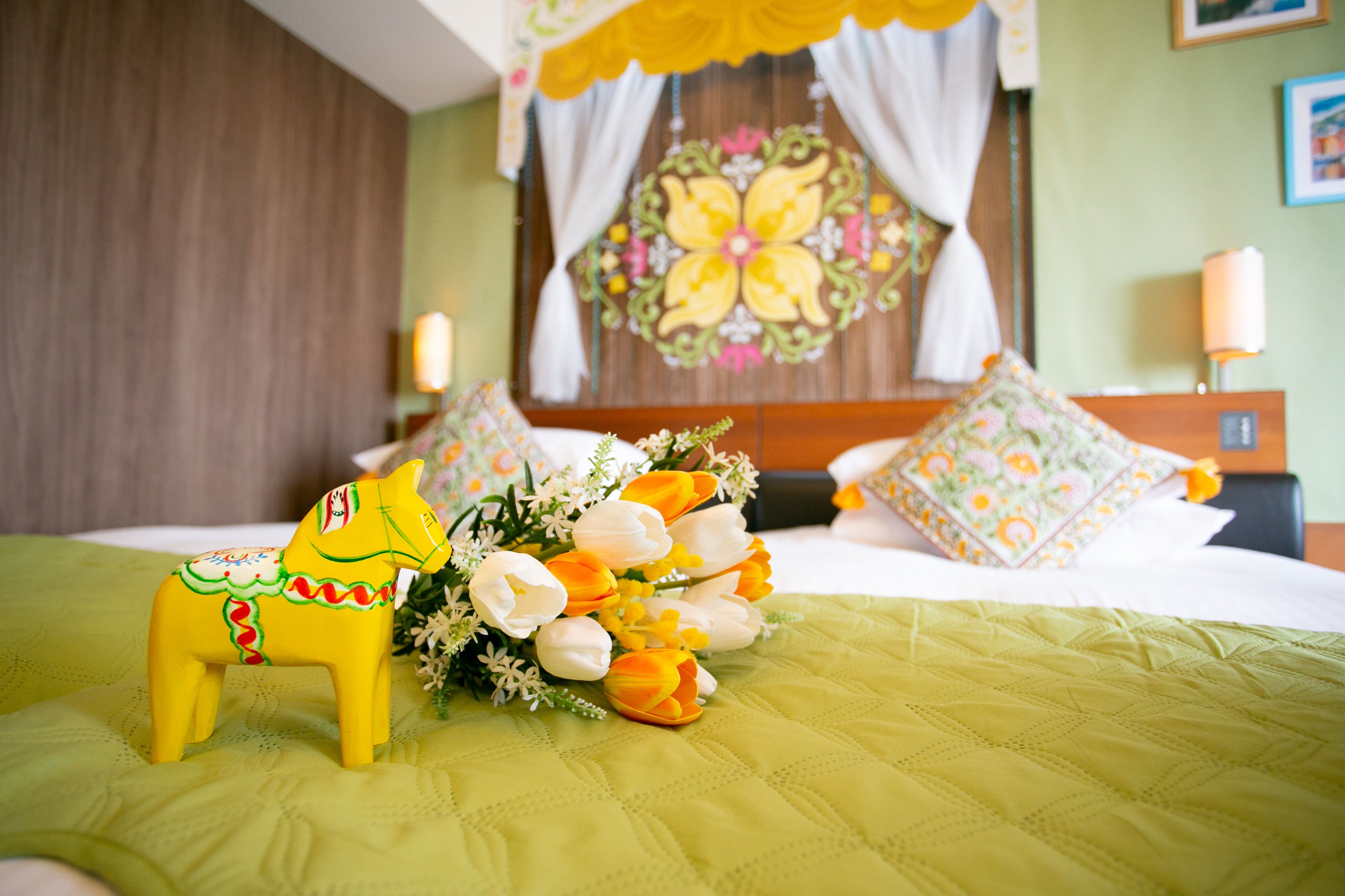 幸せを運ぶお守りとして北欧で愛されている馬の置物「ダーラナホース」が、お部屋ごとに異なるデザインで宿泊ゲストをお出迎えします。さらにバスケットの中には撮影用小物としても使用できるチューリップのブーケもご用意。物語の主人公になった気分で思い出の一枚をぜひ。