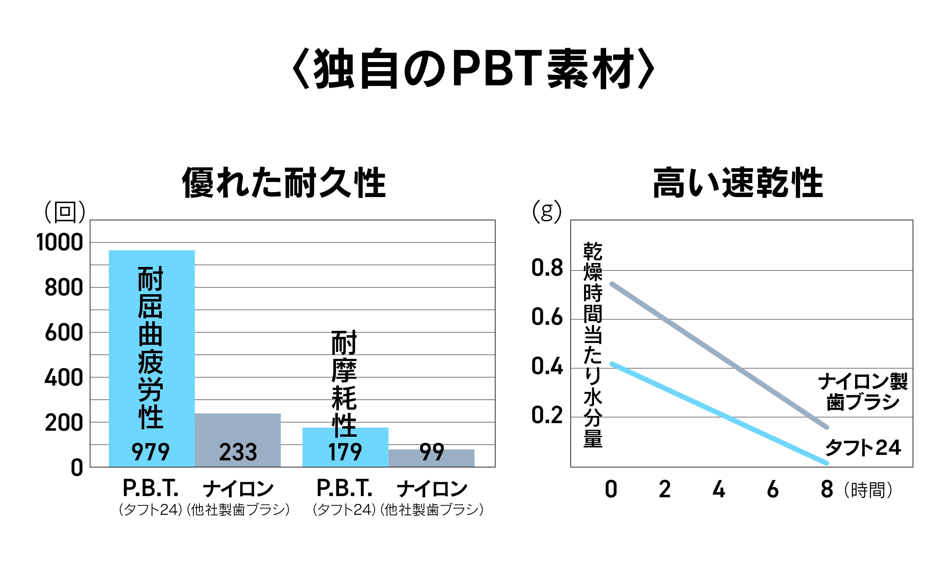 こだわり3. 独自のPBT素材歯のプラークをきちんと落とすためには、毛のコシが必要。「タフト」シリーズに使っているPBT素材は水はけがよく、一般的な歯ブラシよりも長くコシを保てます。