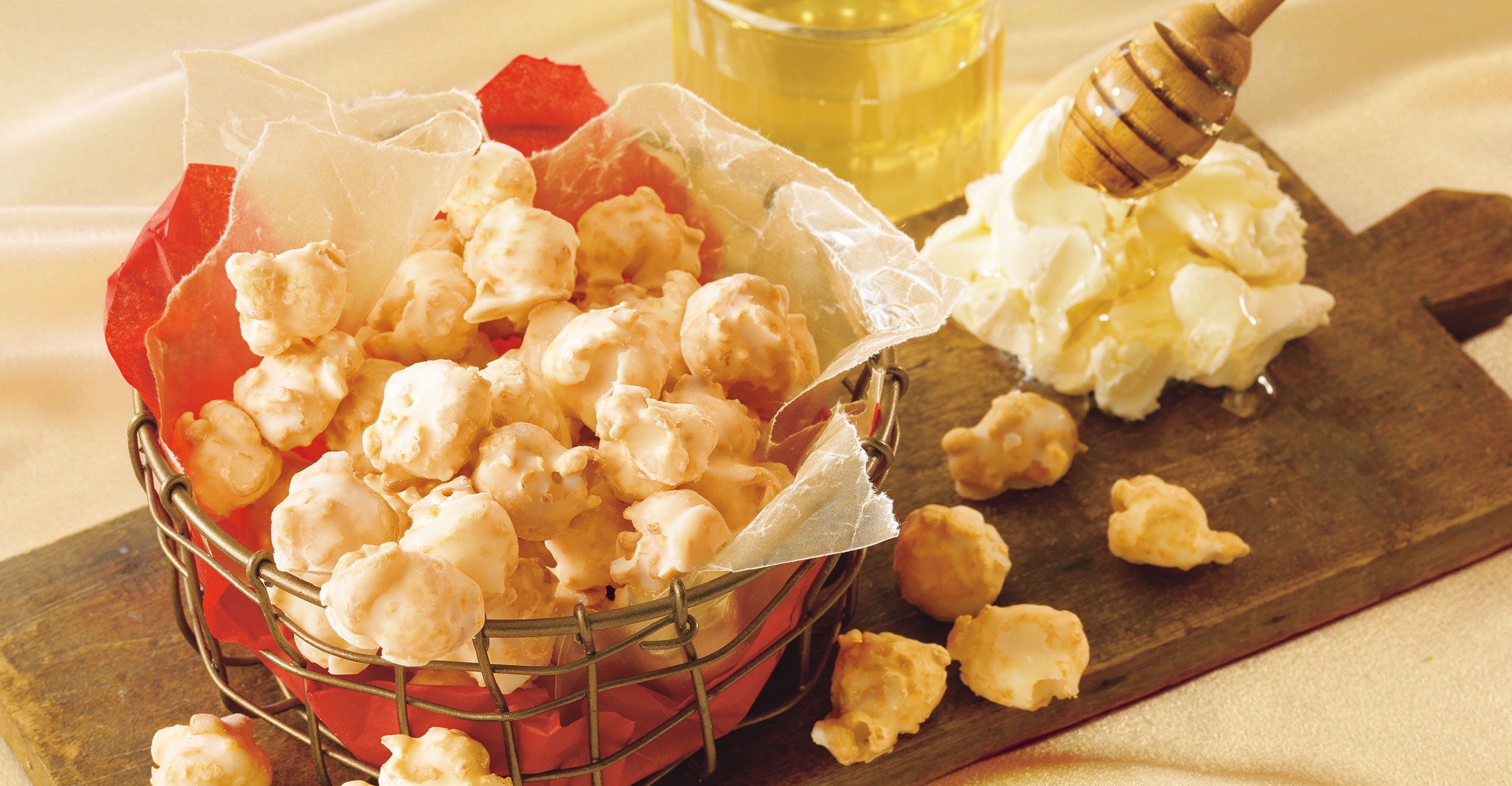 はちみつを入れてキャラメリゼ(飴がけ)したポップコーンを、チーズが香るホワイトチョコレートでコーティングしました。チョコレートのまろやかな口どけとともに、クリームチーズの酸味とはちみつのコクが広がり、次から次へと食べたくなるおいしさを生み出します。