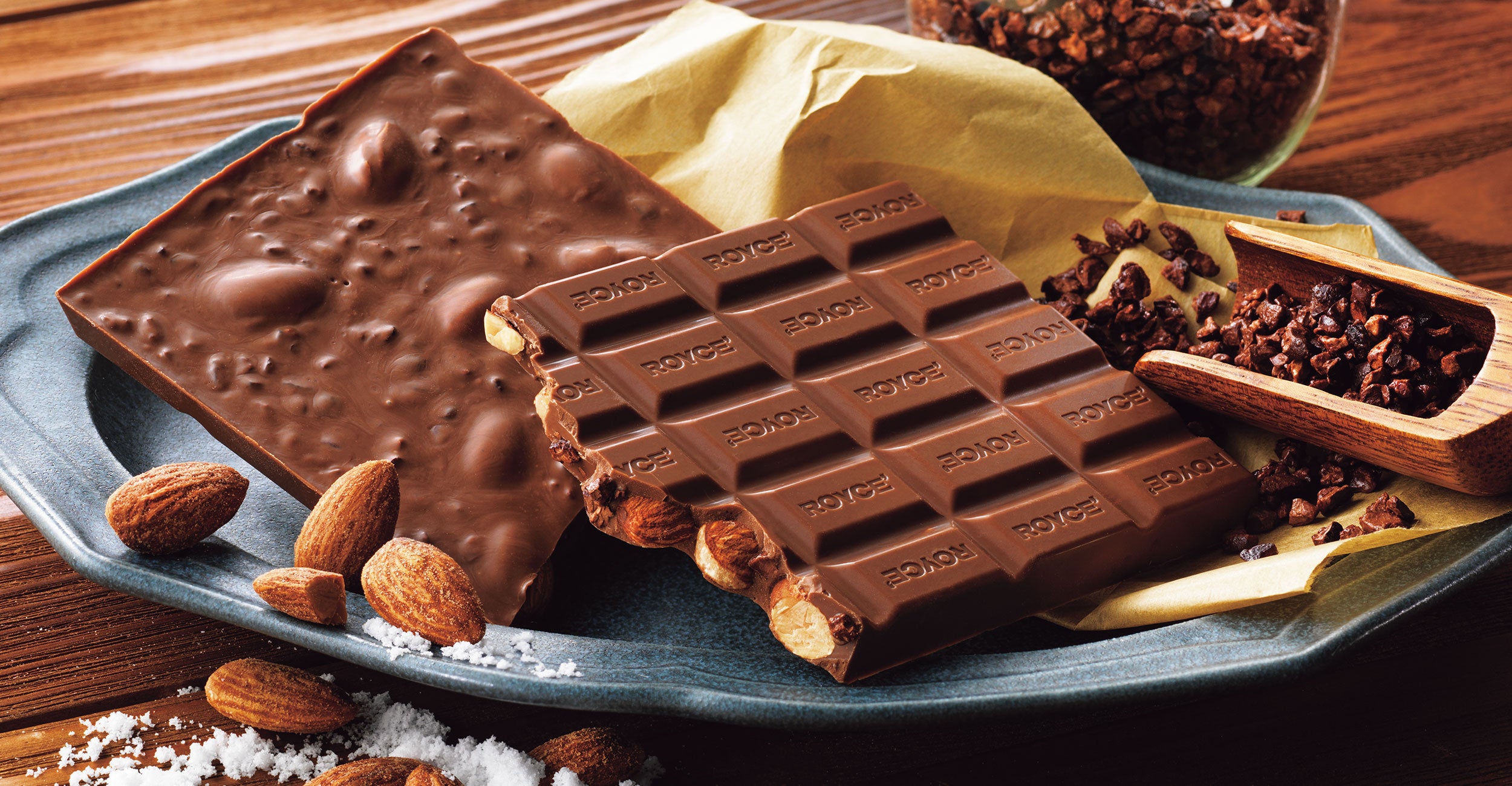 塩がけしたアーモンドとキャンディング(飴がけ)したカカオニブを、板チョコレートの中に散りばめました。カリッとしたアーモンドとシャリシャリとしたカカオニブ、2つの食感が楽しい板チョコレートは、もうひと口食べたくなるおいしさです。