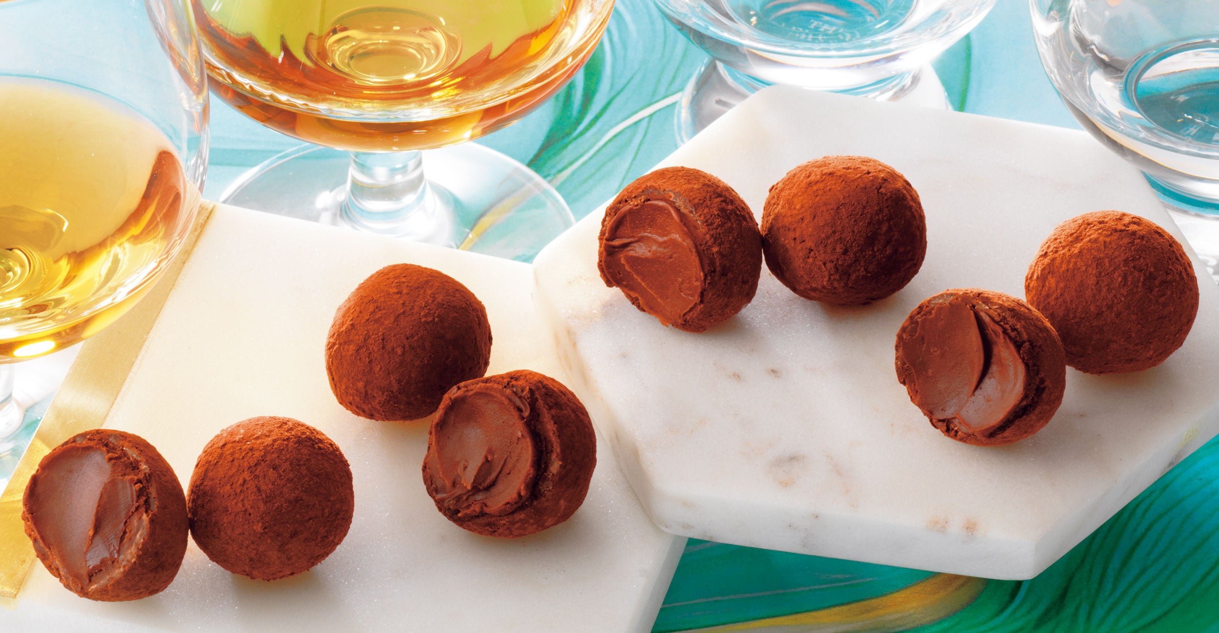 フレンチラム「ディロン ラム オルダージュ XO」「ラムJ.M XO」「ビエール ブラン」「ペールラバ ブラン」をトリフに。ラム酒の風味の違いを存分に味わっていただくため、4種類のトリフのレシピはラム酒以外は同じにしています。それぞれのフレンチラムの個性が引き立つこだわりのトリフで、4種の食べくらべをお楽しみください。