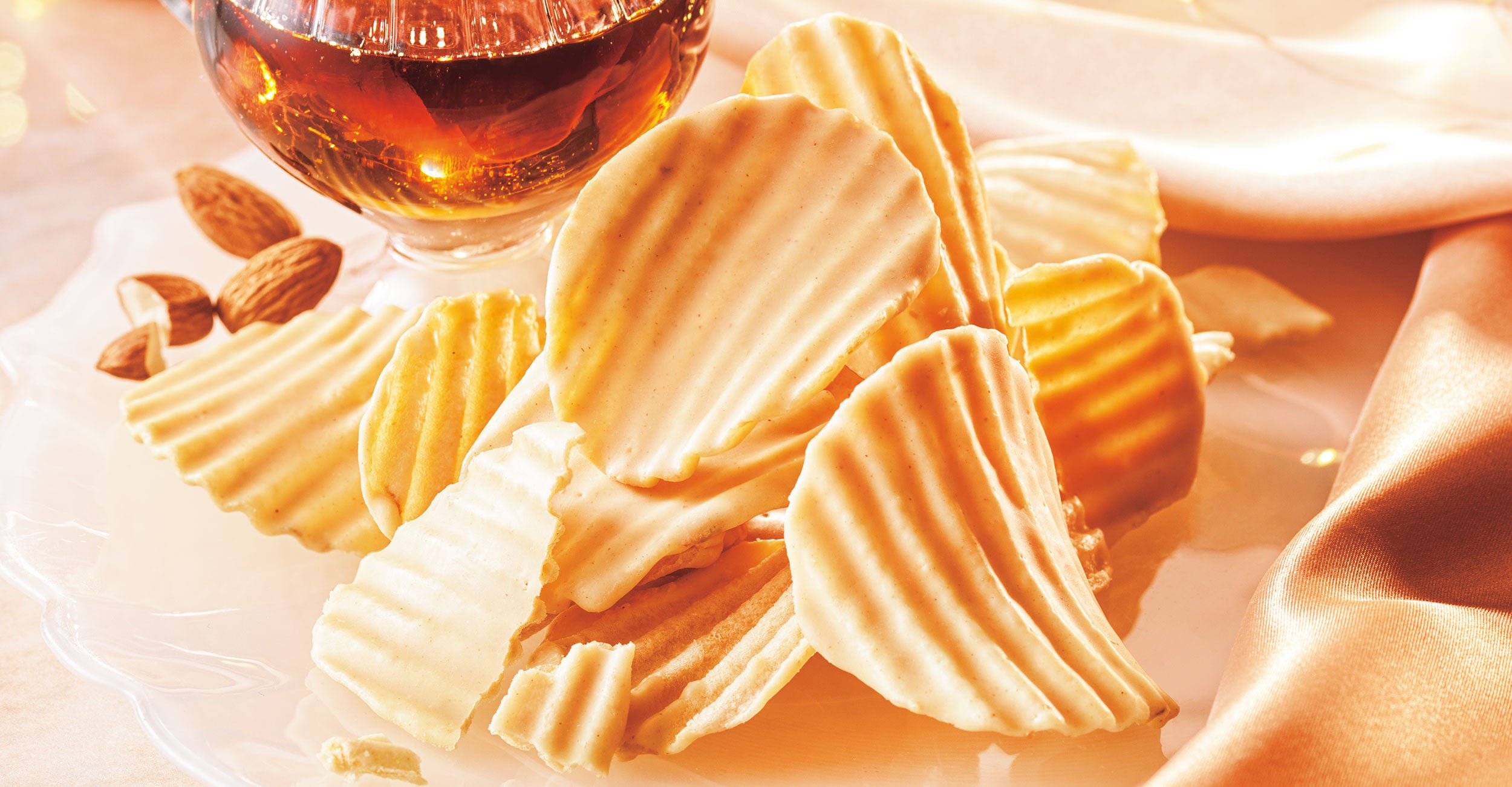 メープルシュガーとアーモンドプラリネペーストを加えたチョコレートを、パリッとしたポテトチップの片面にコーティングしました。ほんのり塩味のポテトチップとやさしいメープルシュガーの風味が絶妙なバランスの、手が止まらなくなるおいしさです。後味にほんのりナッツが香ります。