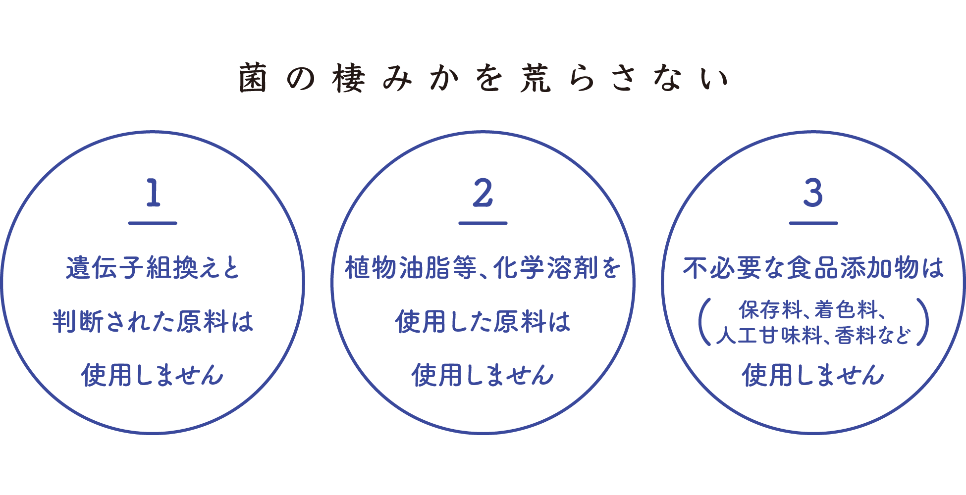 菌のリレーに沿った美味しい健康食品で発酵腸活習慣を提案します。人の体に必要なものだけを厳選し、自社基準に基づき、体に不要なものはいれません。