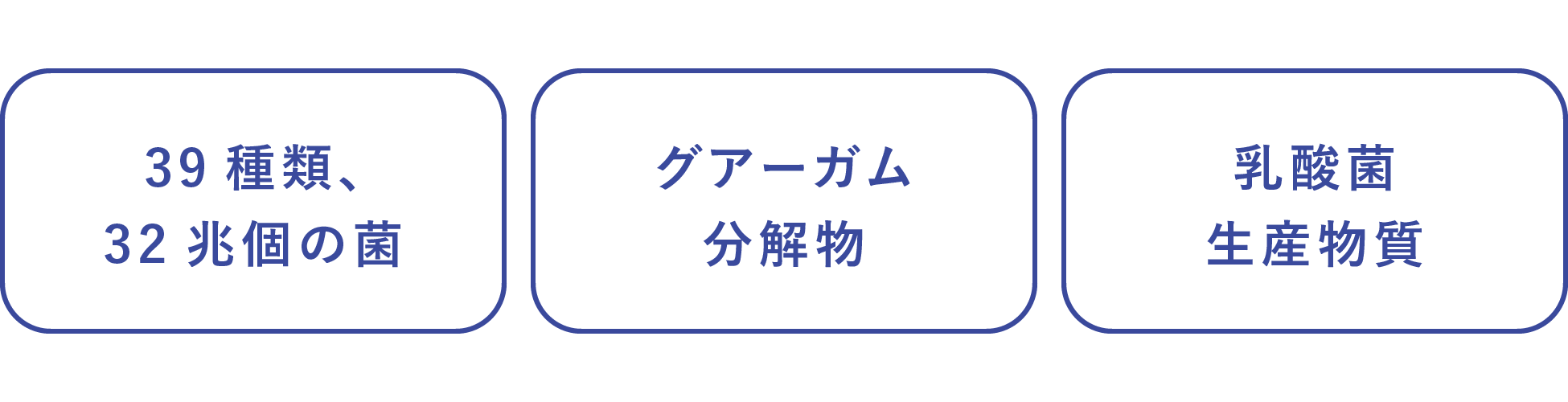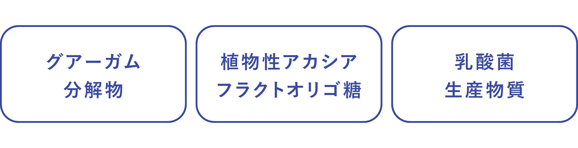 発酵に適した水溶性食物繊維であるグアーガム分解物、アフリカ産の植物由来アカシア、そして日常の食事では摂取量が限られるフラクトオリゴ糖を配合。