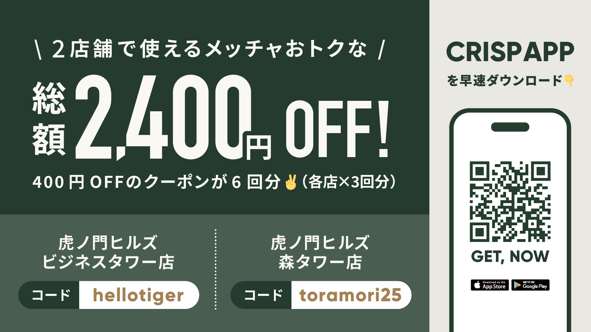 本キャンペーンでは、虎ノ門ヒルズ内での2店舗目オープンを記念して、「虎ノ門ヒルズ ビジネスタワー店」と「虎ノ門ヒルズ 森タワー店」の2店舗で利用可能な総額2,400円OFFのクーポンを配布します。