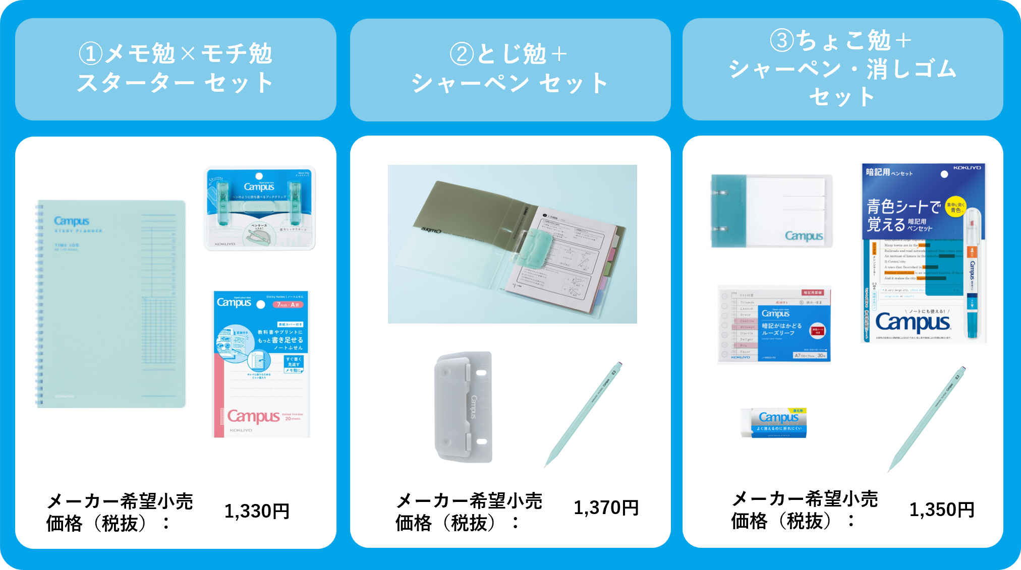 が提案する『まなびレシピ』から、今回のイベントを記念したオリジナルの「メモ勉×モチ勉 スターター セット」、「とじ勉+シャーペン セット」、「ちょこ勉+シャーペン・消しゴム セット」をハンズ新宿店、ならびにイオンモール与野にて販売します。