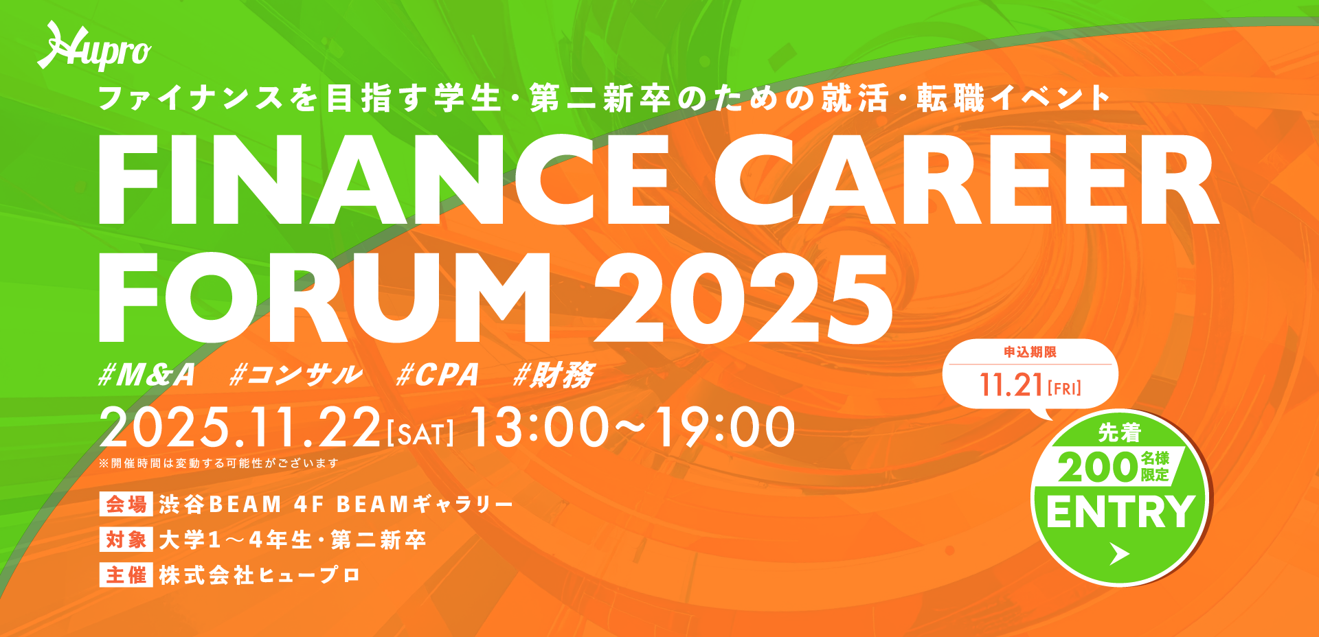税務・会計・財務などファイナンス領域に関心を持つ学生および若手社会人を対象にした就活・転職イベント「Finance Career Forum 2025」を開催いたします。