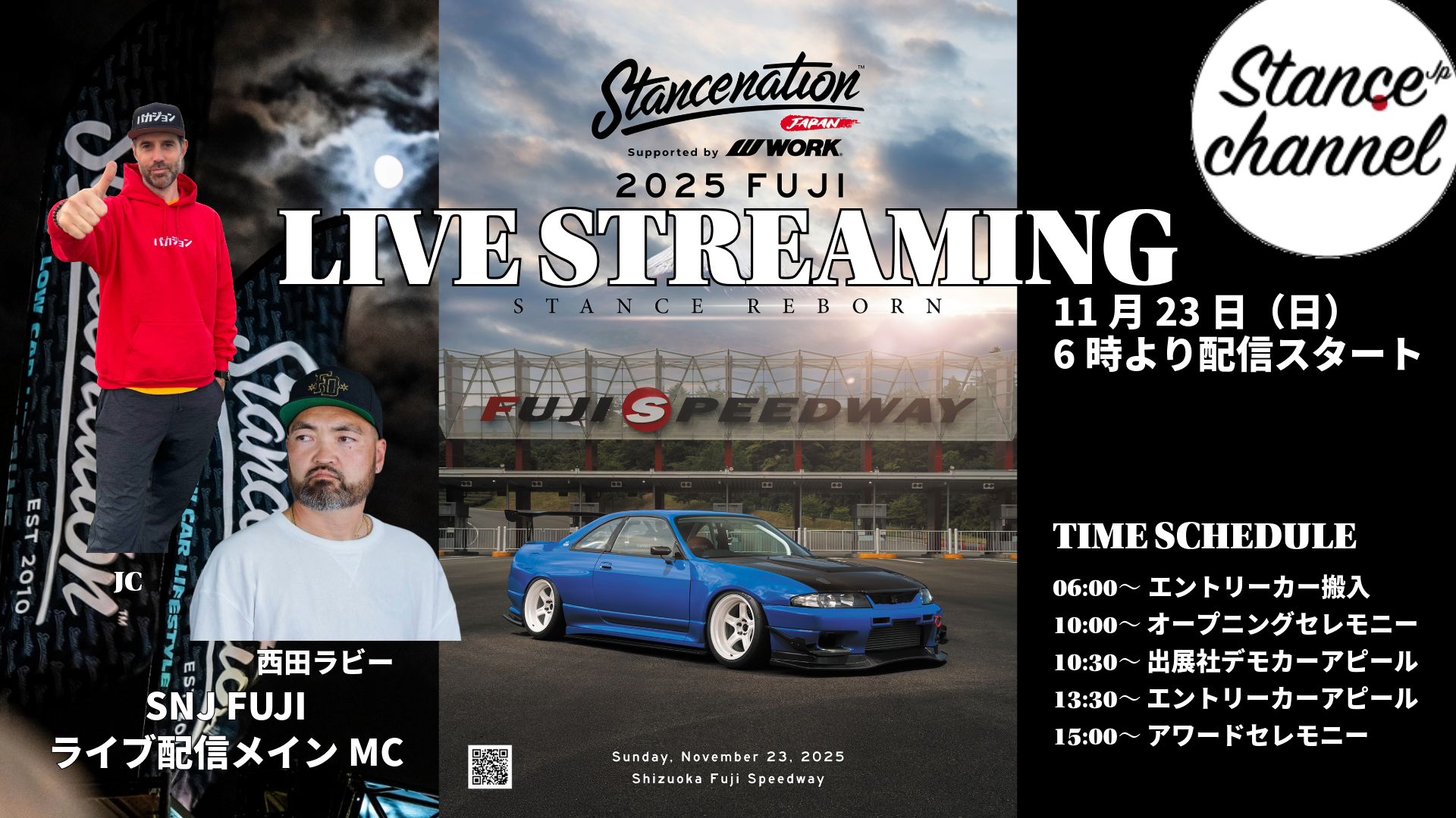 SNJはクルマイジリをずっと楽しむユーザーと過ごす時間をより大切にするために、今までの大型カーフェスから出展社&エントリーカーみんなが楽しめる参加型のカーガイのためのイベントに変貌します。そのメインコンテンツとして取り組むのが"SNJ ライブストリーミング"です。SNJやスタンス・マガジンのムービーをアップしているYOUTUBE"Stance JP Channel"から世界に発信! SNJ FUJIの模様を世界中の人が観覧できます。MCは元プロドリフトドライバーで今ではYouTuberを始めデジタルクリエイターとして活躍する"西田ラビー (@robbienishida )"。そして、もう1人はスタンスネイションジャパンのライブ配信といえばこの人、クルマの楽しさを発信するバカジョンでおなじみ"JC(@jc.pepino )"。 どちらも大がつくクルマ好きということでSTANCENATION JAPAN supported by WORK 2025 FUJのライブ配信はさらに盛り上がりを見せようとしています。