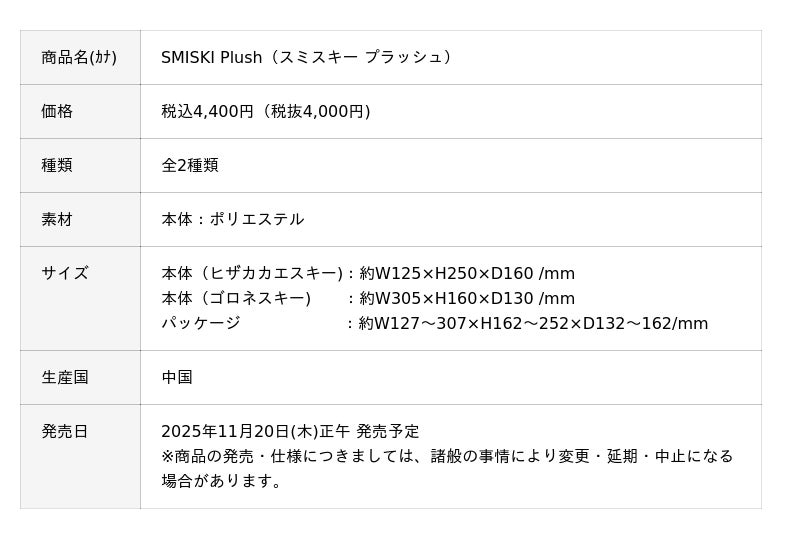 株式会社ドリームズ(本社:東京都新宿区/代表取締役 添谷徹)は、あなたを見守るスミが好きな妖精「スミスキー」より『SMISKI Plush (スミスキー プラッシュ)』を、2025年11月20日(木)正午に発売します。今年10周年を迎えたスミスキーがぬいぐるみになって登場!あなたとお部屋で一緒にくつろいでいるような「ヒザカカエスキー」と「ゴロネスキー」がラインナップ。部屋の"スミ"にインテリアとして置いたり、お家でのリラックスタイムに抱きしめて癒されたり、スミスキーとの生活をより充実させたい方におすすめのアイテムです。ドリームズオンラインショップでは、2025年11月5日(水)正午より先行予約を開始します。