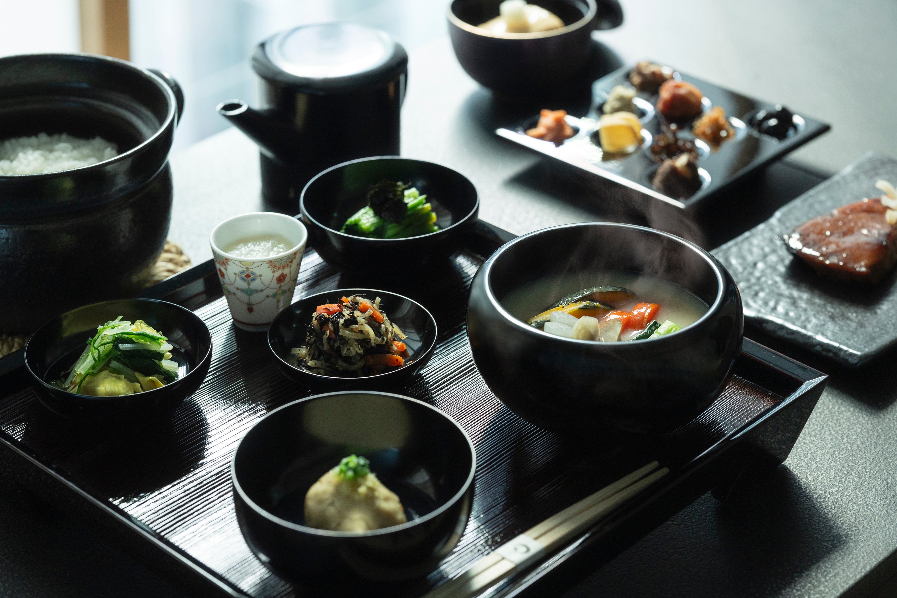 日本料理の「五味・五色・五法」の思想に基づいた、心身のバランスを調える朝食です。寒さが厳しいこの時期は、生命力の回復を目指し、五色のうちの「黒」に着目。黒豆、海苔、きくらげなど、黒色の食材を豊富に取り入れています。すり流しには旬の蕪を使用し、味噌汁には体を芯から温める大根やごぼうなどの根菜を加えることで、体の内側から調和を促します。