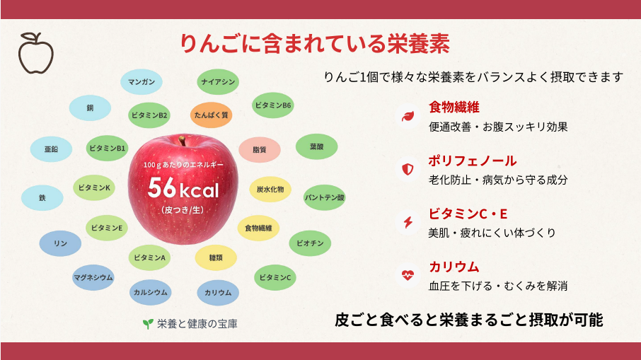 りんごには食物繊維、カリウム、ポリフェノール、ビタミンCなどが豊富に含まれています。「一日一個のりんごで医者いらず」と言われる所以です。