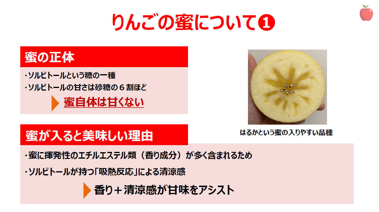 蜜の正体はソルビトールという糖の一種で、蜜自体は甘くありません。蜜に含まれる香り成分と清涼感が甘味をアシストします。蜜が入る品種は「ふじ」、「ぐんま名月」などで、標高が高い場所、寒い地域ほど蜜が入りやすい傾向があります。
