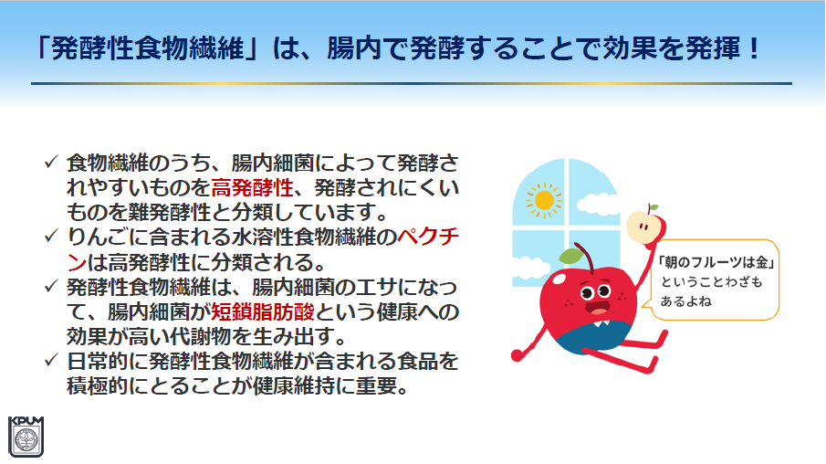 食物繊維のうち、腸内細菌によって発酵されやすいものを高発酵性、発酵されにくいものを難発酵性と分類しています。りんごに含まれる水溶性食物繊維のペクチンは高発酵性食物繊維に分類され、腸内細菌のエサになります。発酵性食物繊維が腸内で発酵することで、腸内細菌が「短鎖脂肪酸(酢酸、プロピオン酸、酪酸)」という健康への効果が高い代謝物を生み出します。日常的に発酵性食物繊維が含まれる食品を積極的にとることが健康維持に重要です。