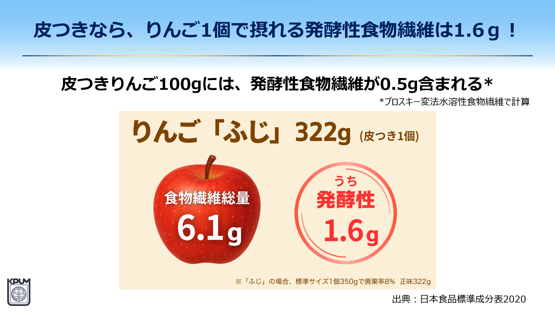 りんごの皮には食物繊維が豊富に含まれており、皮ごと食べることで栄養効果を最大限に得ることができます。しかし、りんごを皮ごと食べる人の割合は、男性が28.1%、女性が21.5%にとどまっています(国民健康・栄養調査、平成29年)。皮ごと食べることで、発酵性食物繊維であるペクチンを効率的に摂取でき、短鎖脂肪酸の産生を促進することができます。