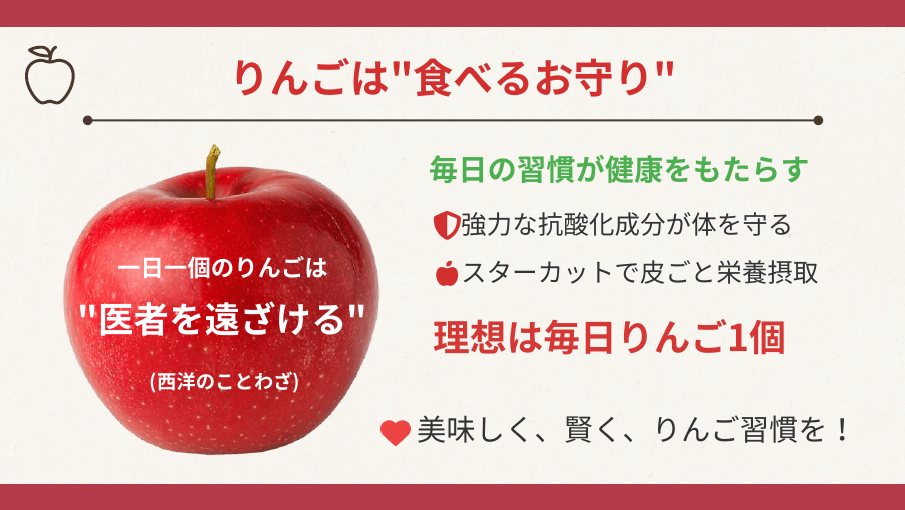 りんごには、食物繊維、ビタミン、ミネラル、そして強力な抗酸化作用を持つポリフェノールが理想的なバランスで含まれています。「毎日くだもの200グラム」を目標に、りんごを食べる食習慣をつけることが推奨されます。