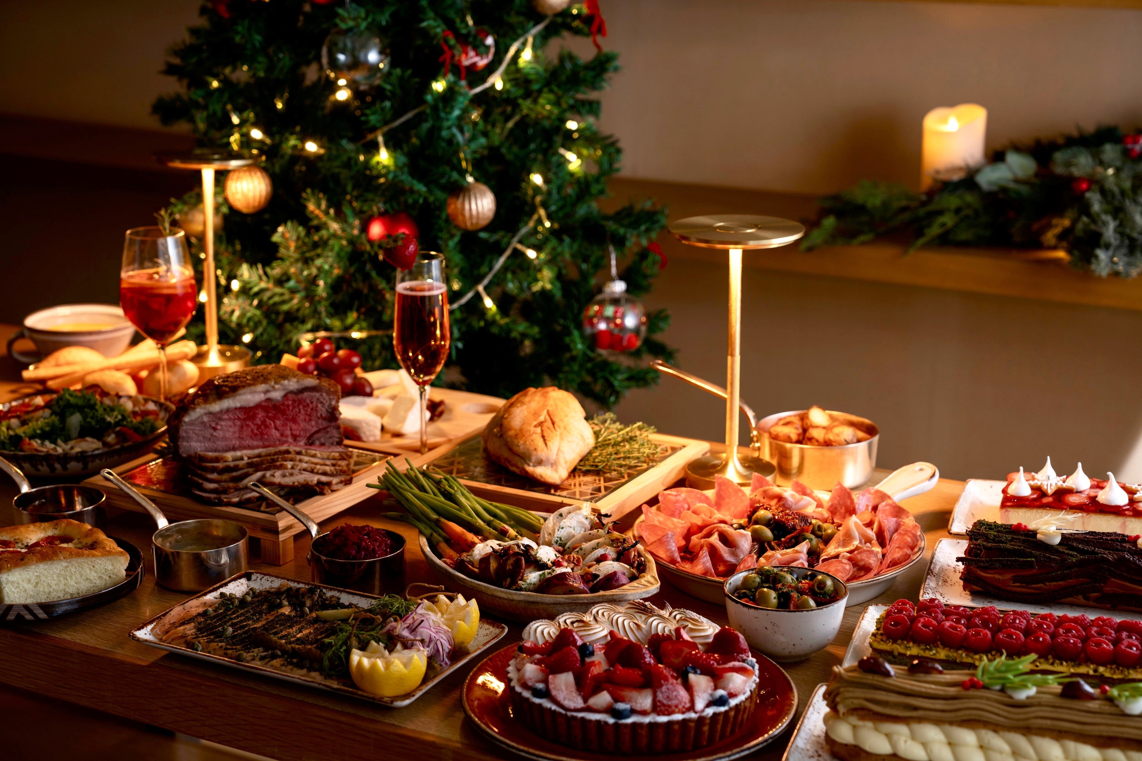 夜はより贅沢に、シュリンプカクテルや国産牛ローストなど、豪華な料理がブッフェ台を彩ります。目にも美しいお料理やデザートの数々がフェスティブ ムードを高め、クリスマスから新年の祝宴にふさわしい特別な時間を演出します。