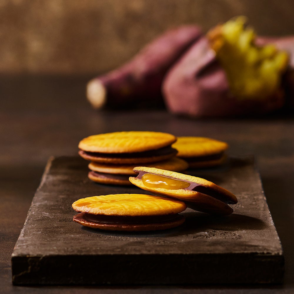 さつま芋のパウダーとペーストを混ぜ合わせて、バターと生クリームで香り高く炊き上げたとろけるキャラメルをミルクチョコレートで包み込み、さつま芋の香り豊かなバタークッキーでサンドしました。