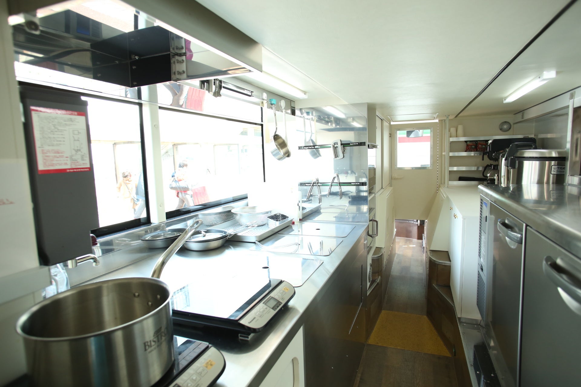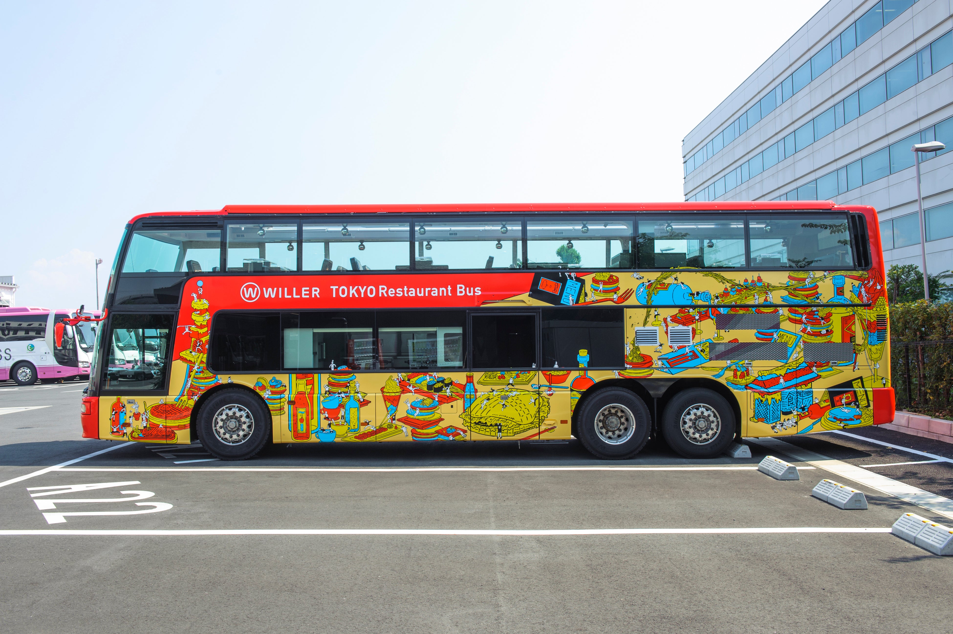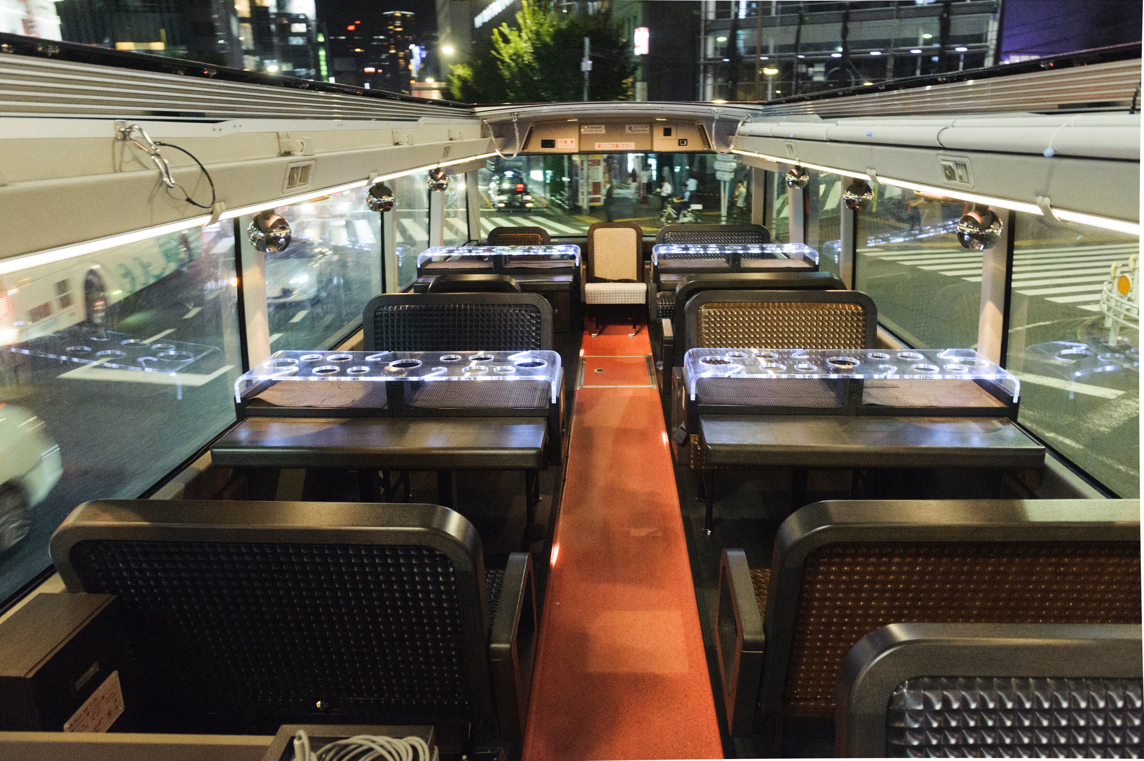 移動と食の融合により新たな感動体験を提供する「レストランバス」は、1階にキッチン、2階には対面式の座席とテーブルを備え、透明で開閉可能なオープンルーフは開放感があり、いつもと違う目線から眺める景色と、本格的な料理をお楽しみいただけます。東京レストランバスの外装は、東京らしさをイメージし、多数のビル群や観光名所を"食"と掛け合わせてポップなカラーリングでデザインしています。内装は、シックな色合いでまとめ、夜は調光可能なLEDと間接照明により、高級感あふれる落ち着いた空間になっています。
