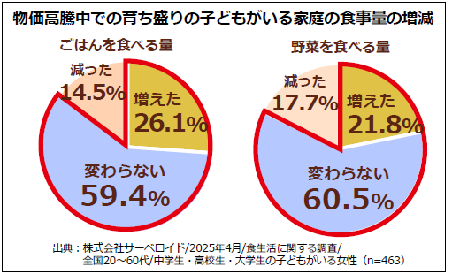 物価高騰で食品の値上がりが続く中でも、育ち盛りの子どもがいる家庭ではごはんと野菜を食べる量はやや増加傾向であることが、2025年4月に実施したインターネット調査※の結果から明らかになりました。(右図)
