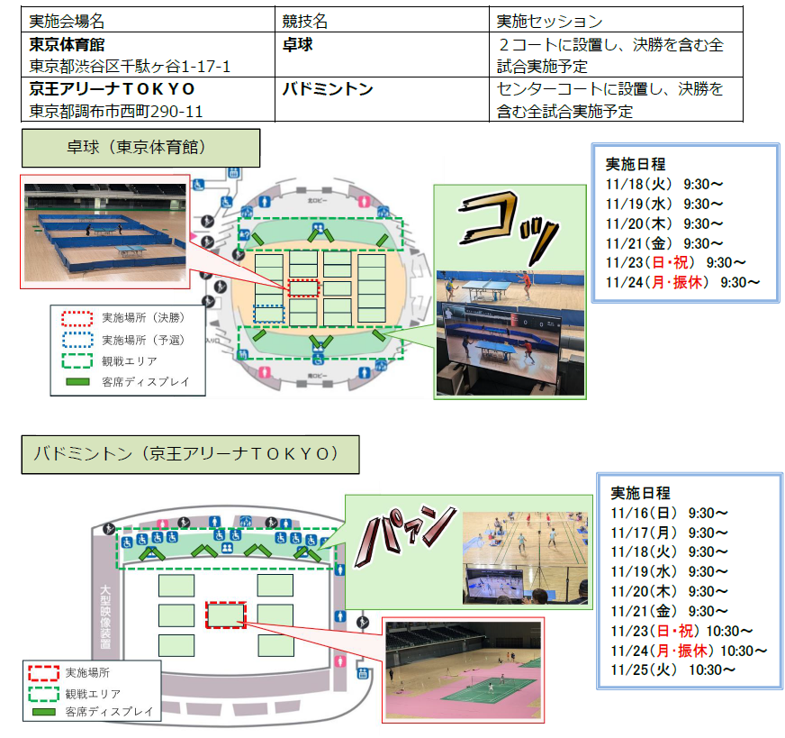 また、卓球、バドミントン、柔道、水泳の各競技会場では、最新のデジタル技術を活用した観戦体験を実施します。