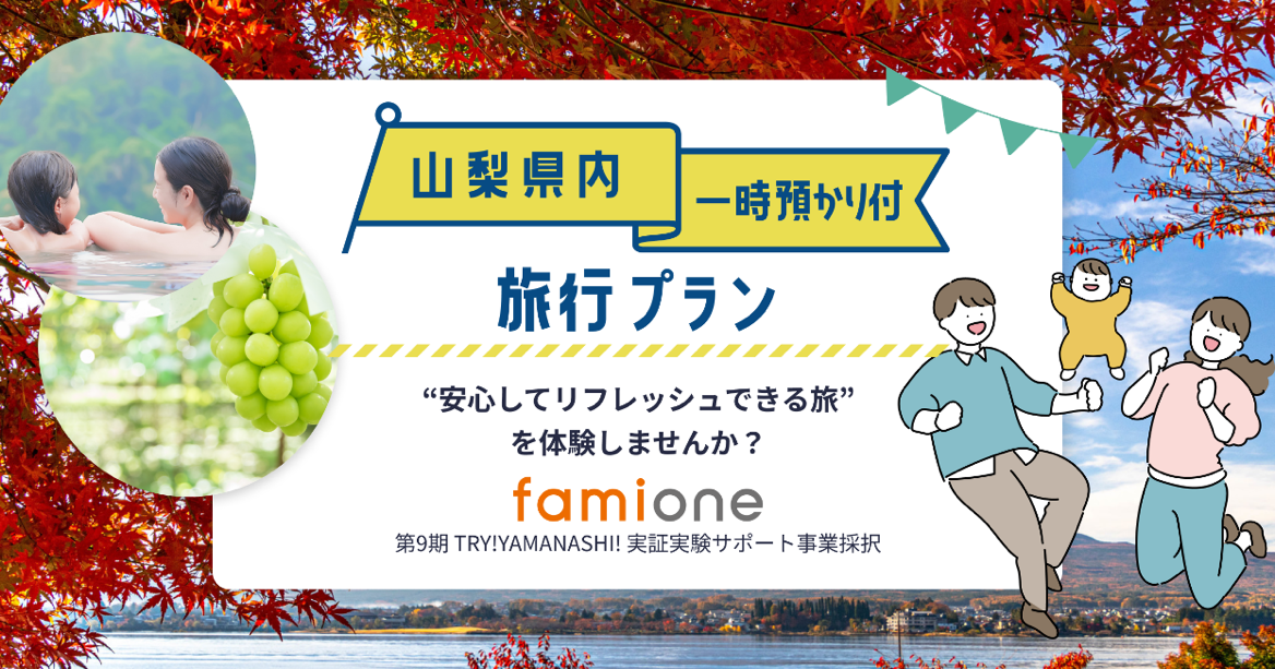 「子どもを願うすべての人によりそい 幸せな人生を歩める社会をつくる」をビジョンに掲げ、法人の従業員向け福利厚生や自治体の住民向け支援を行うヘルスケアサポートサービス「ファミワン」 https://famione.com/benefit/などを展開する株式会社ファミワン(本社:東京都渋谷区、代表取締役:石川勇介)は、山梨県(知事:長崎幸太郎)が実施する、山梨県全域を対象にした実証実験を全面的にサポートする「第9期TRY!YAMANASHI!実証実験サポート事業」に採択された「育児ノイローゼ・子育てうつ対策のための夫婦のリフレッシュ機会提供プロジェクト」の新規事業である「一時託児付き旅行プラン」において、11月12日(水) 『信玄の湯 湯村温泉 旅館明治』(代表取締役社長 笹本健次)での先行実施が決定いたしました。