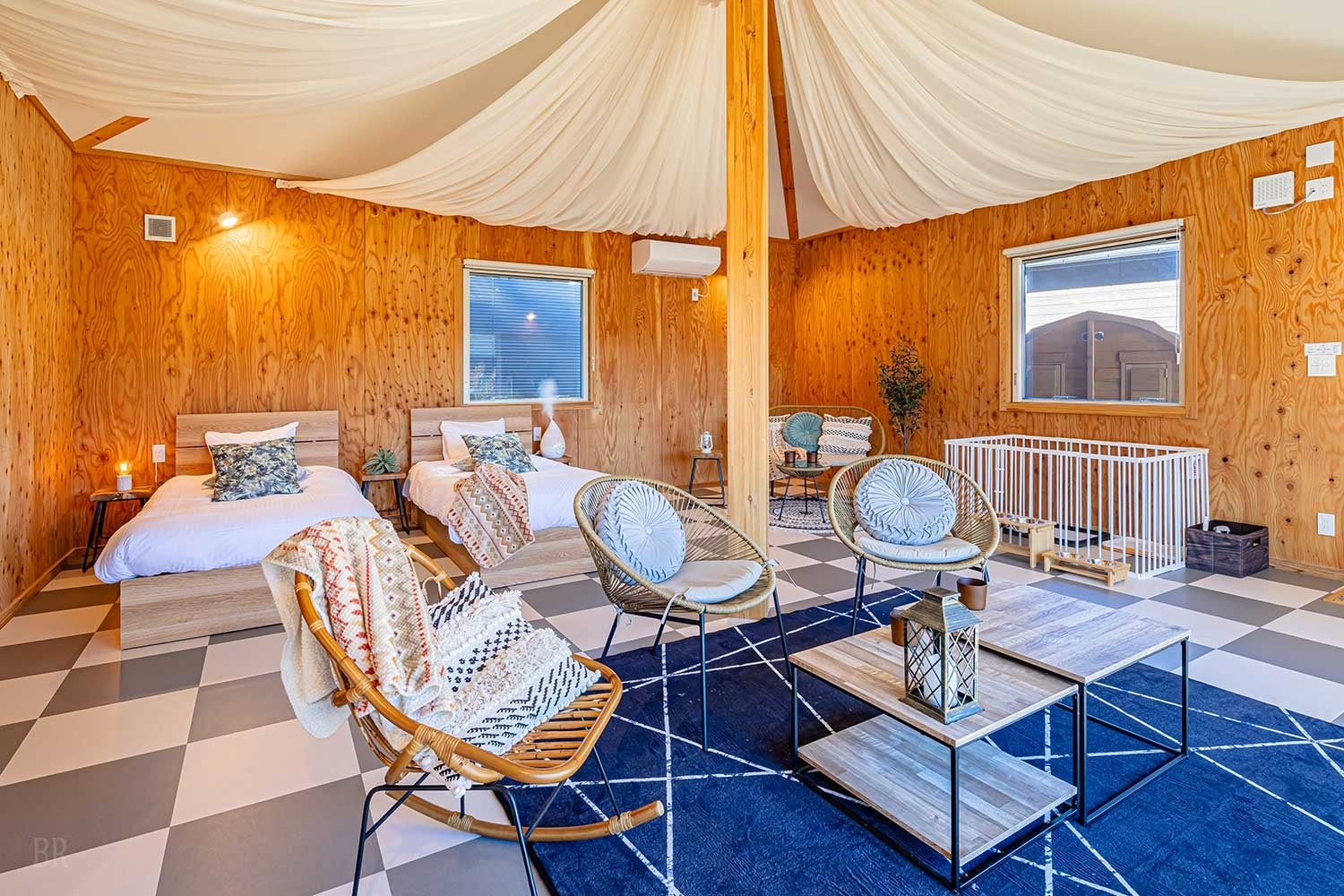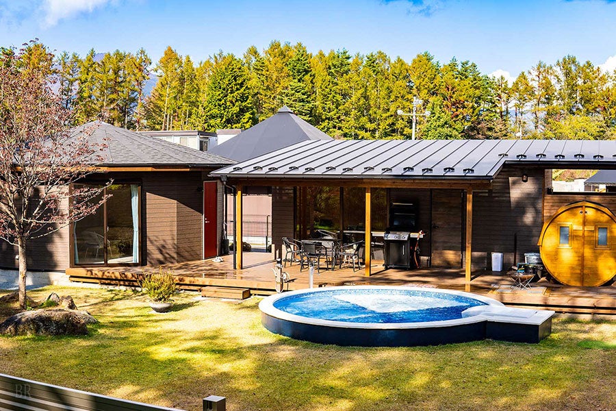 世界遺産「富士山」の麓、山梨県富士河口湖町に位置する、愛犬と特別なひとときを過ごすためのプライベートリゾートです。都心から車で約90分とアクセスに優れ、標高850mの澄んだ空気と満天の星空を堪能できるロケーションにあります。周辺には【富士山パノラマロープウェイ】や【大石公園】など、愛犬と一緒に楽しめる観光スポットも多く、愛犬家にとって人気のエリアです。最大の魅力は、愛犬ファーストな設備と極上のリラックス体験の融合です。全てのお部屋に、天然芝の専用ドッグランを併設。また、富士河口湖の天然温泉を利用した客室温泉とバレルサウナが完備されています。