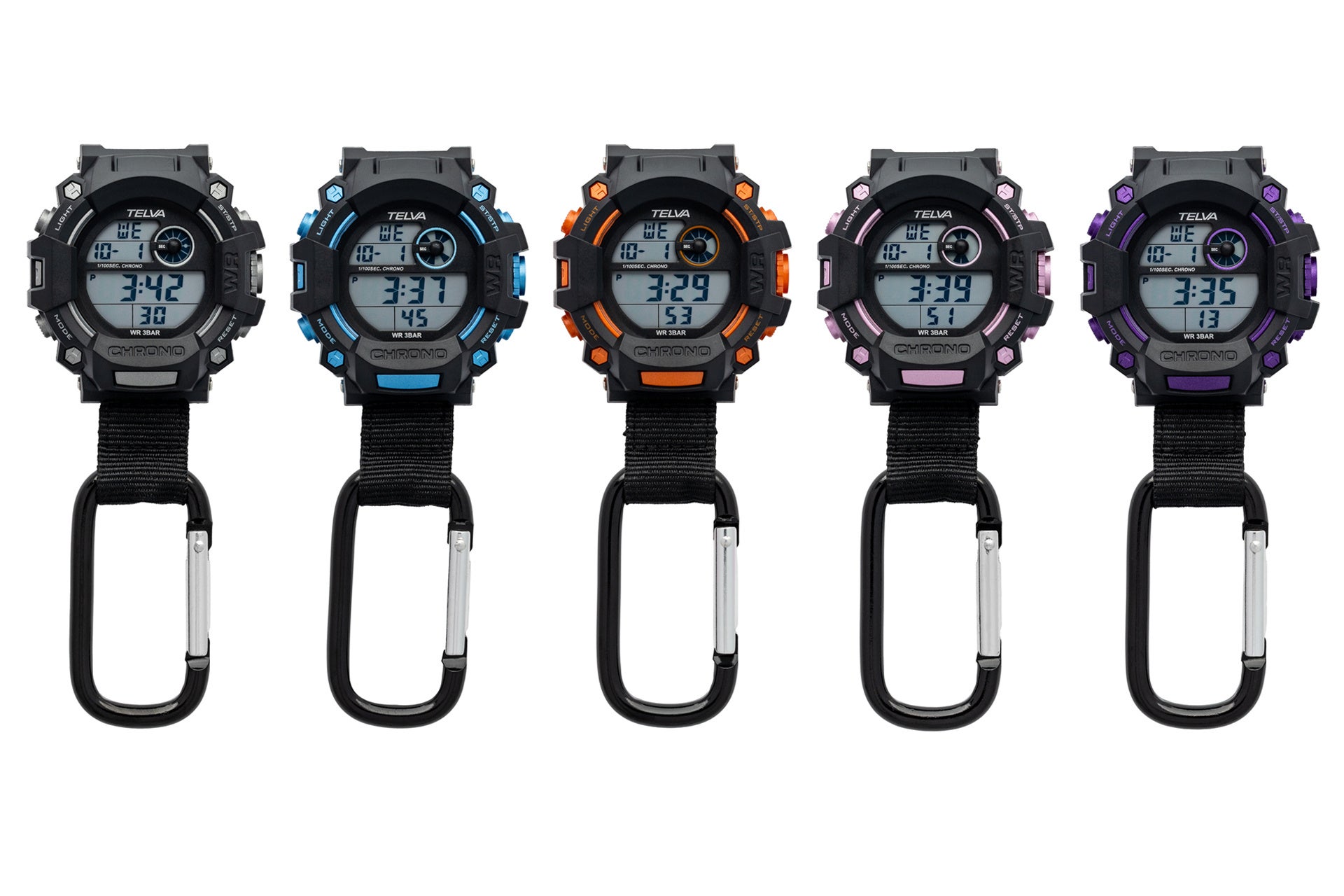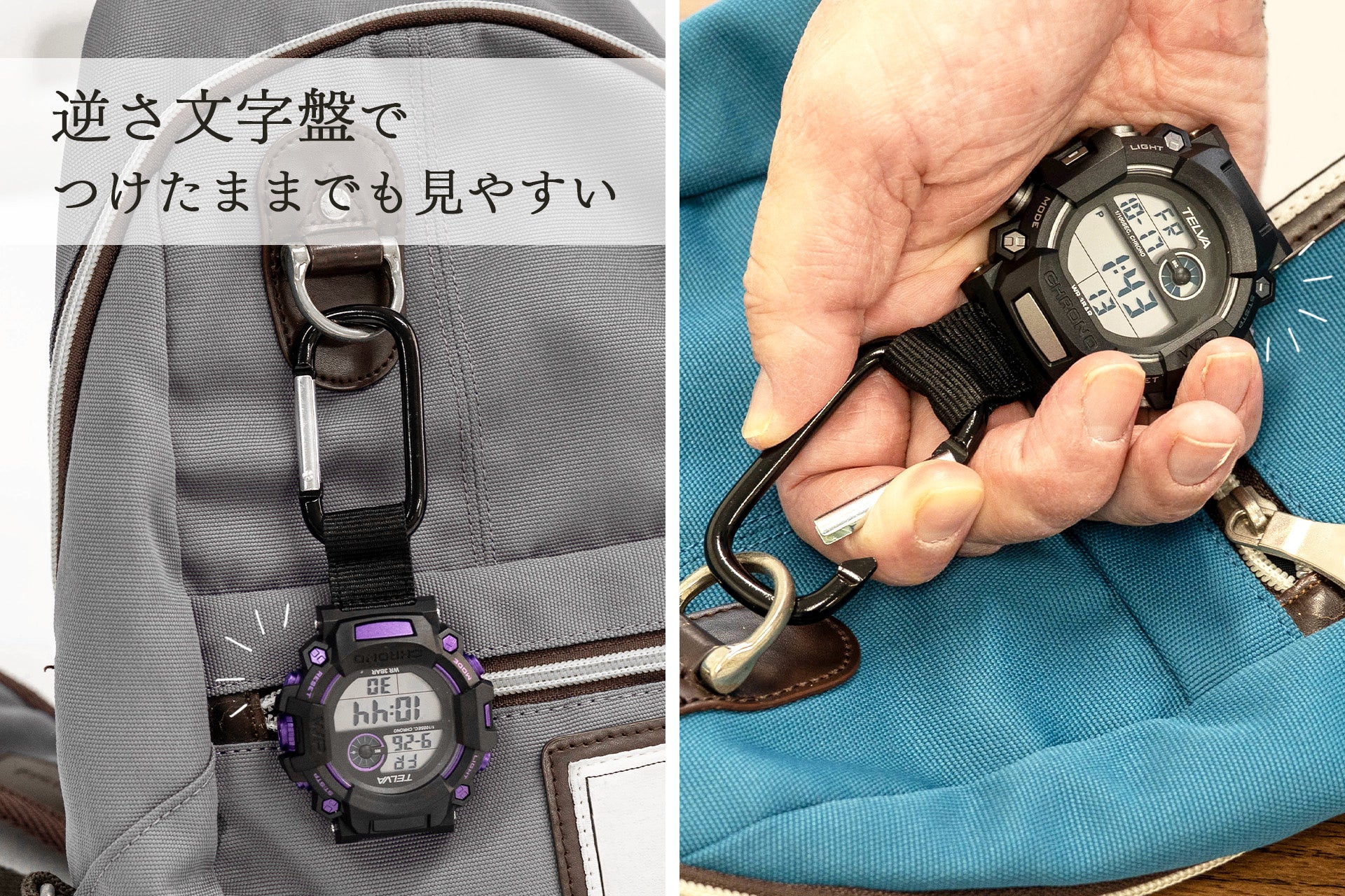 実用的なディスプレイデザインとカラーリングが特長のハンギングウオッチは、黒を基調としてワンポイントカラーにバリエーションを持たせたラインアップとなっています。
