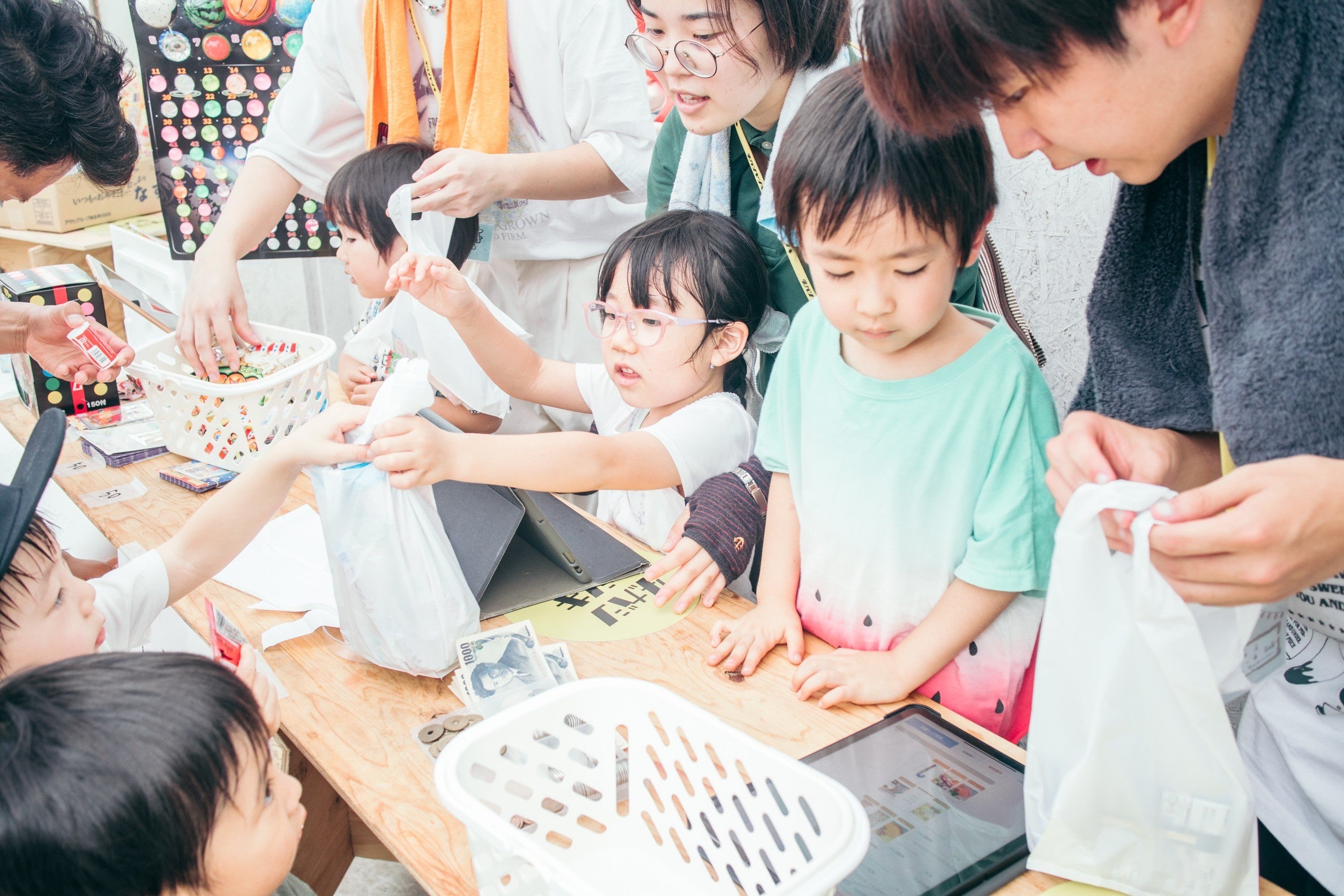 地域の駄菓子屋さんのレジをお手伝いするこどもたち(当法人の過去開催イベントより)