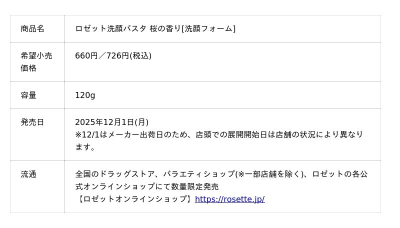 ロゼット株式会社(本社:東京都品川区、代表取締役社長:藤井 敬二)は、95年以上続くロングセラー洗顔ブランド『ロゼット洗顔パスタ』から、数量限定で「ロゼット洗顔パスタ 桜の香り」を2025年12月1日(月)に発売いたします。
