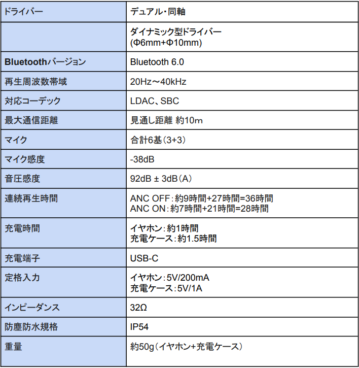 iOS/Android OSアプリ「Edifier ConneX」(無料、日本語対応)をご利用いただくと、ノイズキャ ンセリング設定や、イコライザーを用いた音質調整、サウンドモード、装着検出、タッチコントロー ル設定など「EvoBuds Pro」が持つさまざまな機能を活用いただけます。■製品仕様