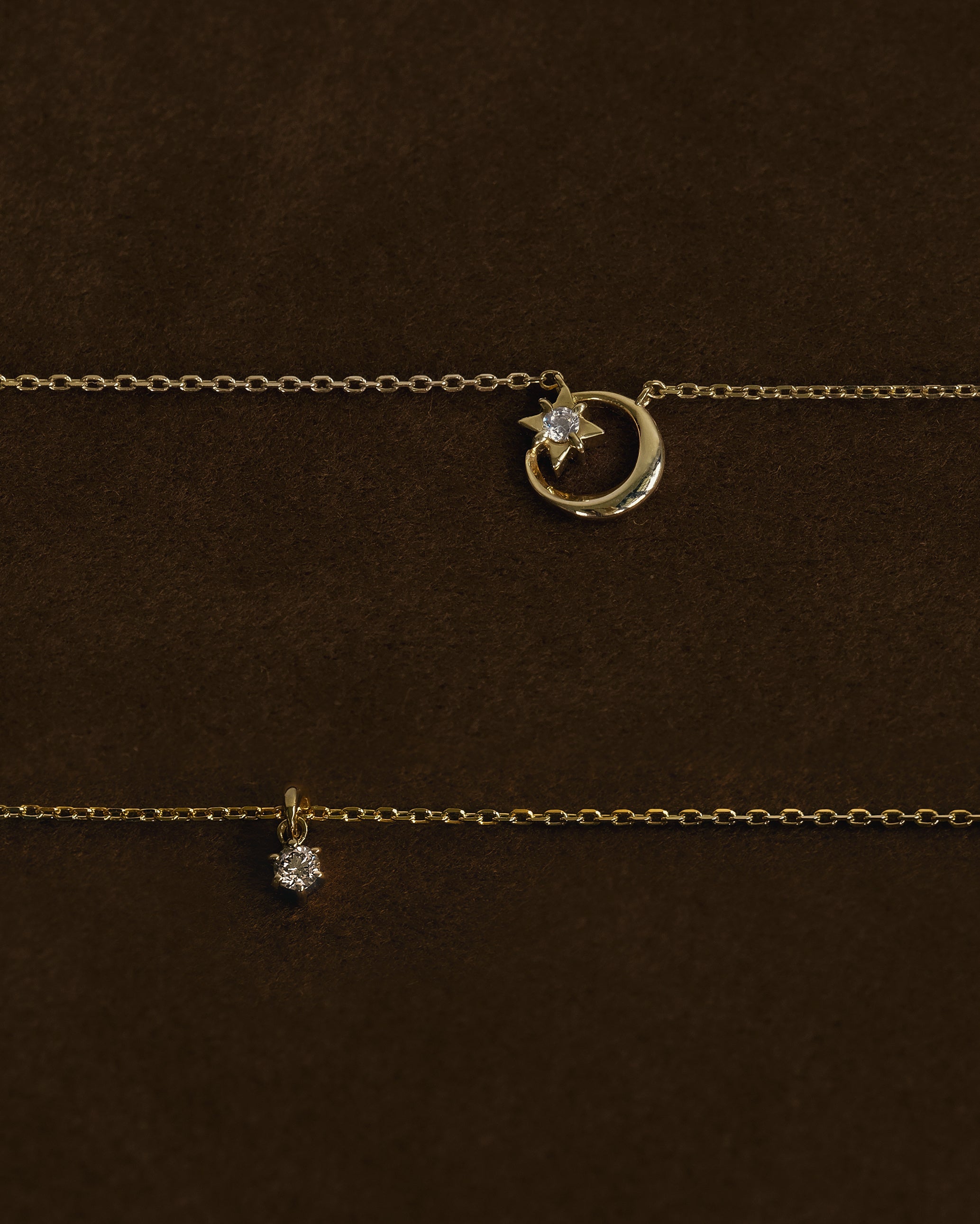 夜空にそっと輝く三日月と星をモチーフにした、ロマンティックなネックレス。成長や希望を象徴する三日月と、願いを託す星を組み合わせ、身に着ける人に幸せをもたらすデザインに仕上げました。