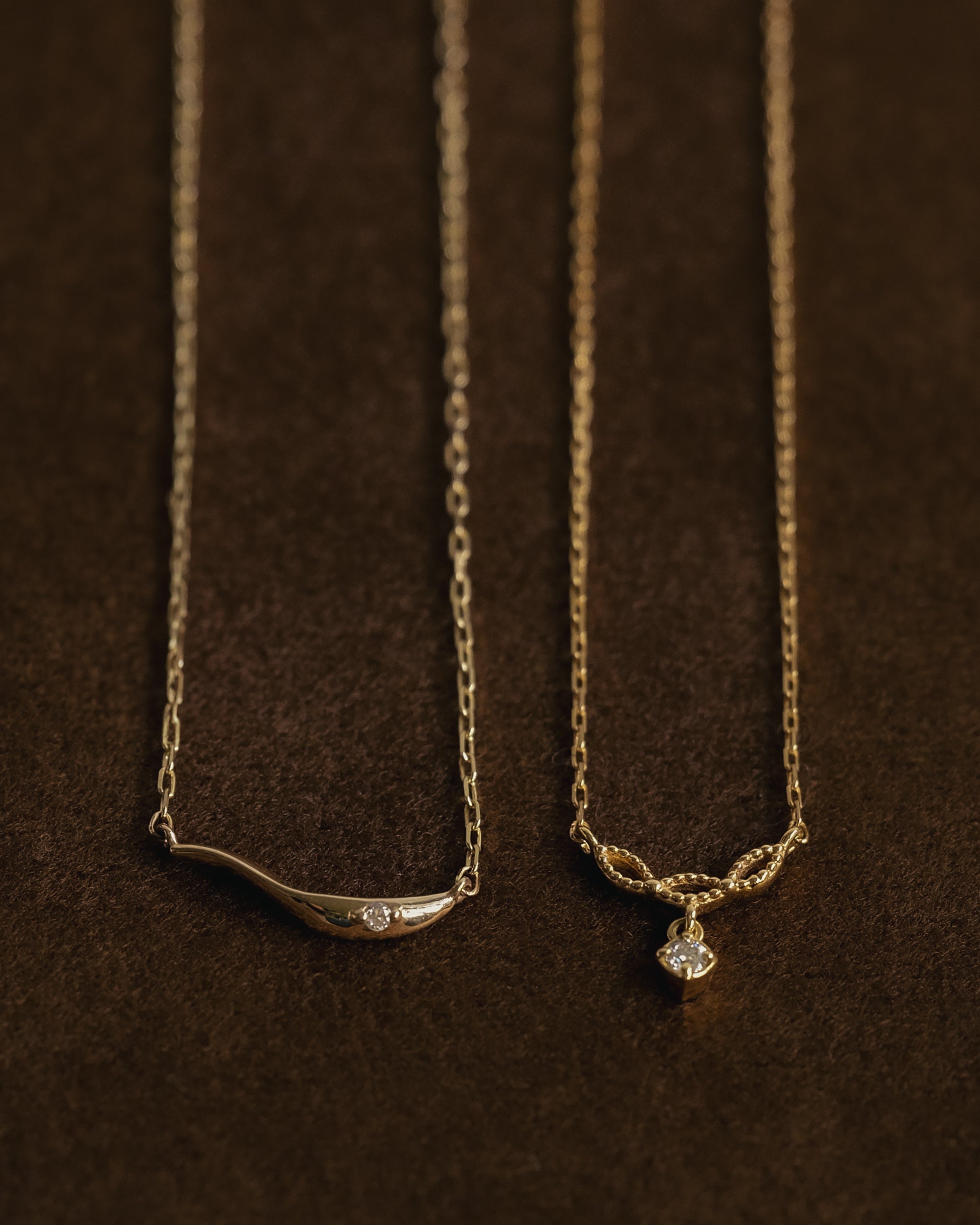 ひねりを加えた流線ラインが美しいネックレスが登場。トップには1粒のダイヤモンドを沿わせ、肌の上で繊細にきらめきます。手持ちのネックレスとのレイヤードも楽しめ、デコルテに馴染む上品なデザインです。