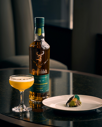 グレンフィディック16年のテイスティングノート、「メープルシロップとキャラメリゼされたジンジャー」のエッセンスを強調するストレートなマリアージュ。リッチなコクを持たせることで、カクテルのキレのある酸味にも調和するよう緻密に配合しました。葉を模したラングドシャーの軽