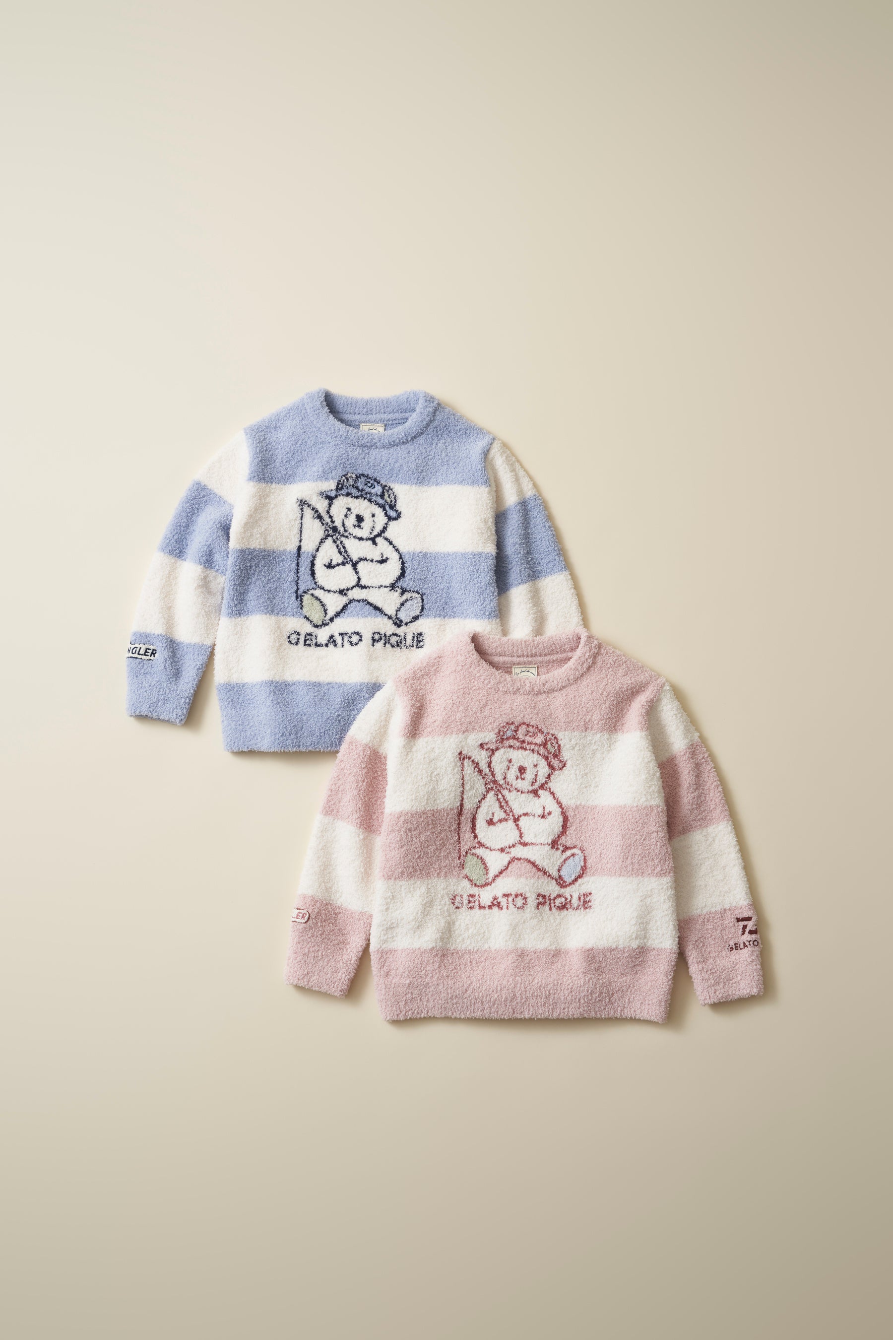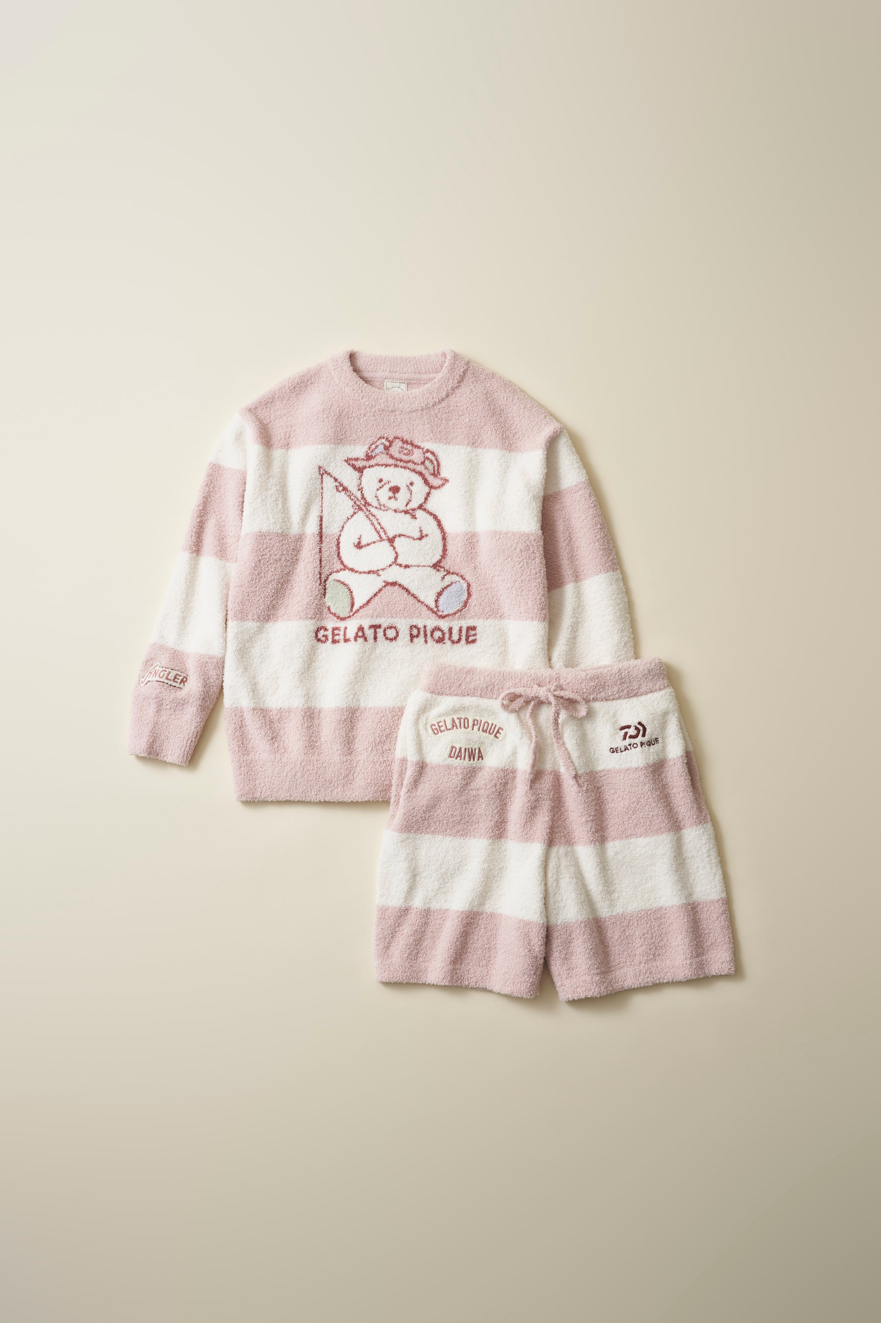 gelato piqueのアイコニックなボーダーデザインに、フィッシングブランド「DAIWA」コラボレーションならではの釣りを楽しむベアの姿を線画タッチで描いたニットアイテム。