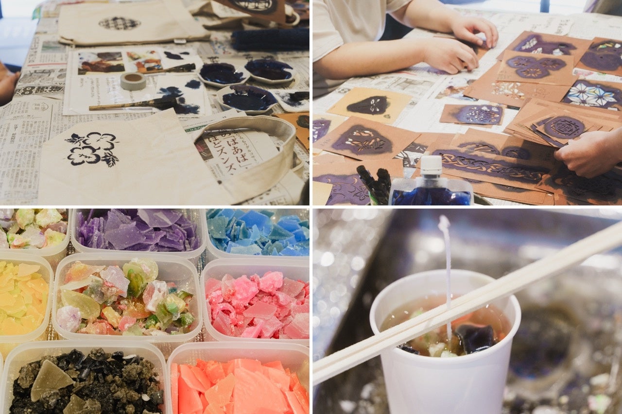 様々な模様から好きなものを選んで、てぬぐいや巾着などに好きな模様を染めることができます(ご持参されたハンカチやTシャツに染めることも可能です)。