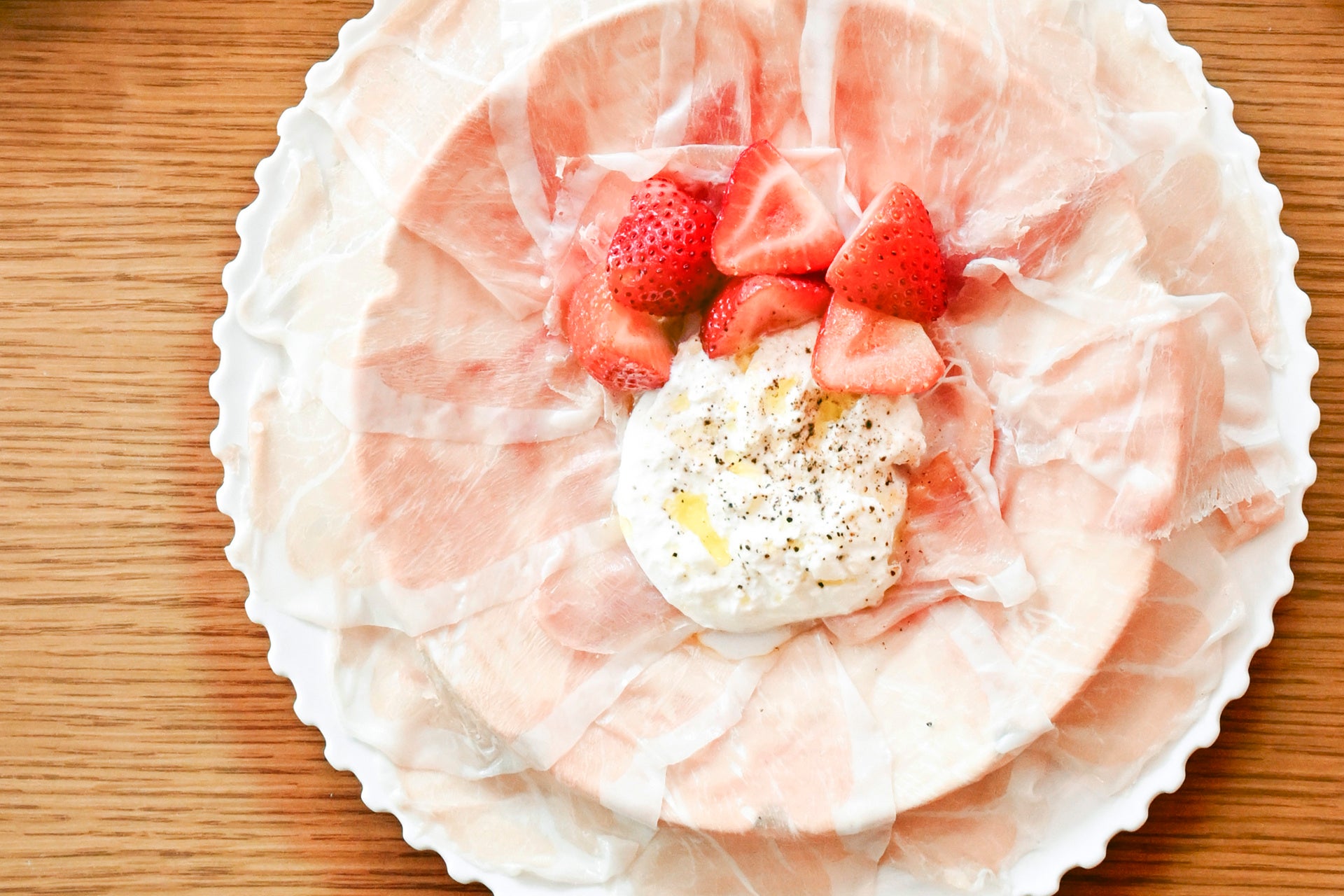 <プロシュート KRAS10ヶ月熟成>すりたてこぼれ生ハム+ブラータチーズと季節のフルーツ