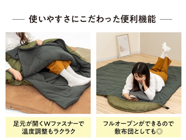 足元に開閉可能なWファスナーを搭載し、簡単に温度調節ができます。フルオープンにすれば、寝袋としてだけでなく、敷布団としても使用可能で、より自由な寝心地を提供します。