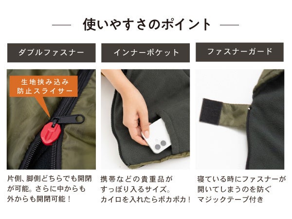 片側、脚元どちらでも開閉可能なダブルファスナーで温度調節が簡単に行えます。内蔵のインナーポケットは、携帯や貴重品を収納できる便利なサイズ。さらに、寝ている時にファスナーが開かないようにファスナーガード付き。