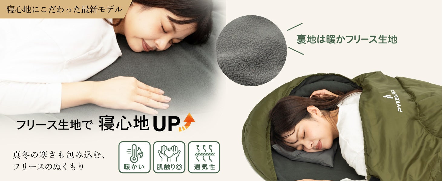 冬キャンプの人気が高まる中、PYKES PEAKには「もっと暖かく、もっと快適に使える寝袋が欲しい」という声が多く寄せられていました。そこで今回、裏地に全面フリース素材を採用することで、従来モデルをさらに進化。冷気を遮断し、肌に触れた瞬間から感じるぬくもりを追求しました。