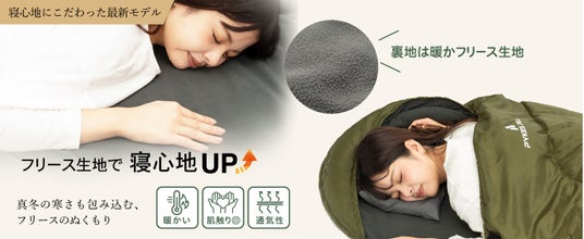 【新商品発売開始】フリース裏地仕様で冬キャンプや車中泊でも快適な暖かさを実現!防寒封筒型寝袋が新登場|3サイズ・3カラー・選べる適応温度でファミリーキャンプにも最適