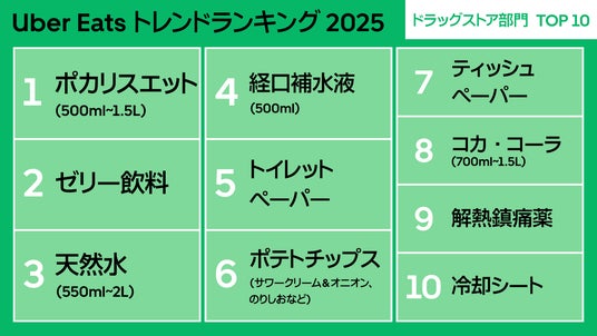 ▪️ドラッグストア部門ランキング: ゼリー飲料から解熱鎮痛薬まで、Uber Eatsは"体調不良時の味方"