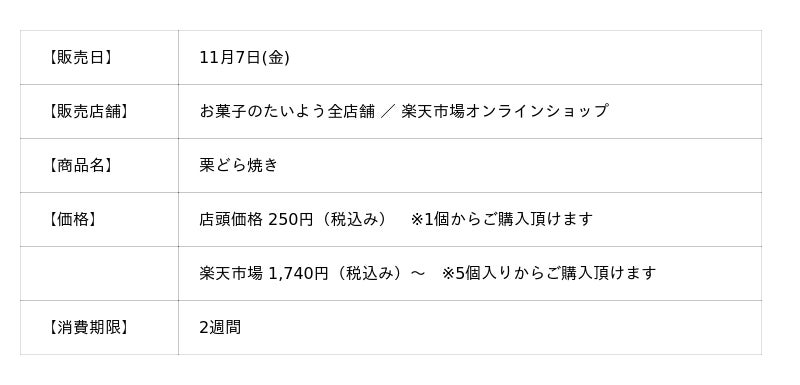 株式会社太陽社(所在地:千葉県匝瑳市飯倉293、代表取締役:片岡正裕)が展開する千葉県で長年愛される菓子店「お菓子のたいよう」は、秋の宝石"一粒栗"がまるごと入った贅沢「栗どら焼き」を、11月7日(金)より発売いたします。秋の覇者といえば、この「栗どら焼き」。毎年発売を心待ちにするファンが多い「栗どら焼き」は、"食べなきゃ秋が終われない"と言われるほど人気の高い一品です。