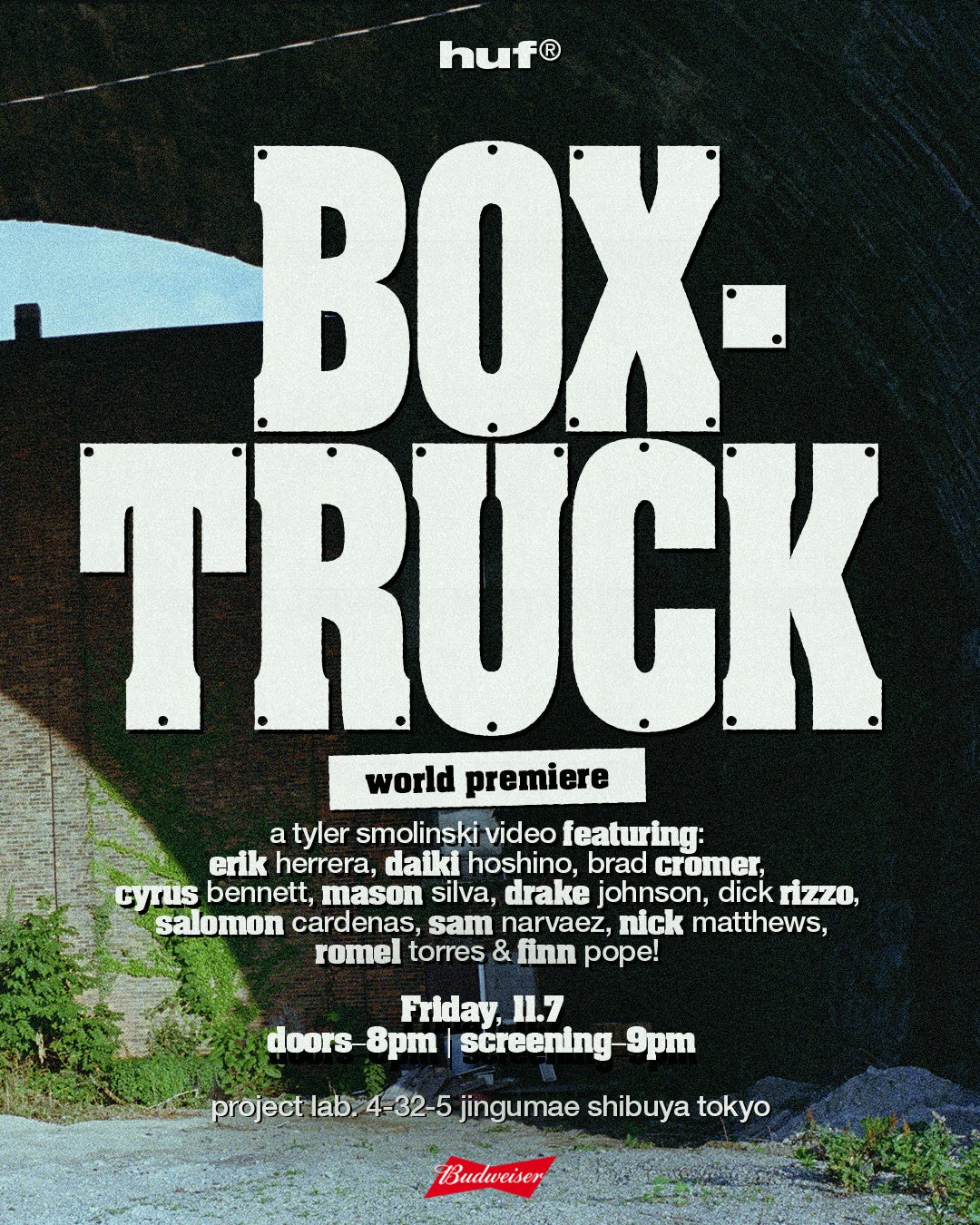 HUF Harajuku Storeでは、11月7日(金)、「HUF」スケートチームライダーが総出演の"Tyler Smolinski" の新作ビデオ『Box-Truck』ジャパンプレミアを開催します。