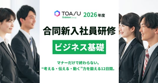 株式会社 学研ホールディングス(東京・品川/代表取締役社長:宮原博昭)のグループ会社、株式会社TOASU(東京・品川/代表取締役社長:宮田 晃)は、2026年度新入社員を対象とした対面式の合同研修『ビジネス基礎』実践プログラムを、2026年4月3日(金)より計12日間の日程で開催いたします。